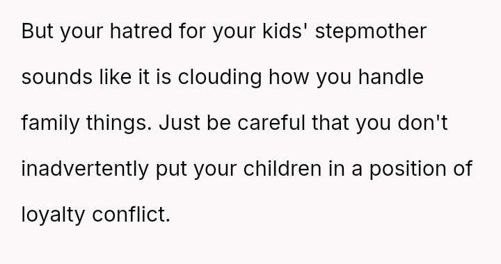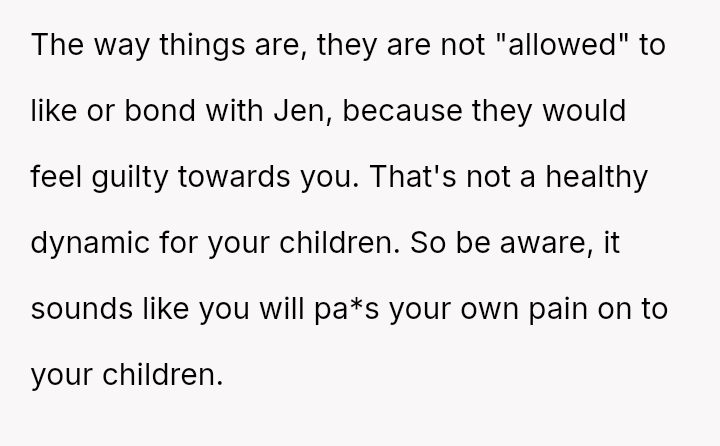Should the OP continue to enforce strict separation and veto any joint activities that involve Jen, or is there a point where accommodating the children's relationship with their father's partner becomes a necessary, albeit uncomfortable, aspect of co-parenting, even when the motivation seems rooted in Jen's personal desires?