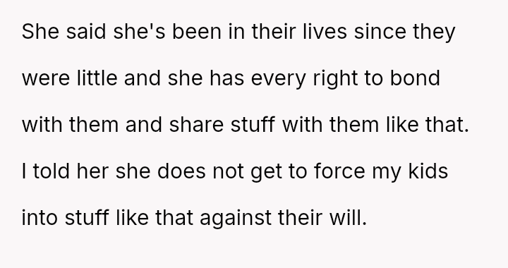 The core conflict lies in the expectation set by the ex and Jen that the OP must facilitate their desired familial role, despite the painful history of the divorce, and the OP's commitment to prioritizing her children's wishes over this external pressure.