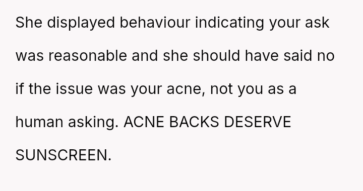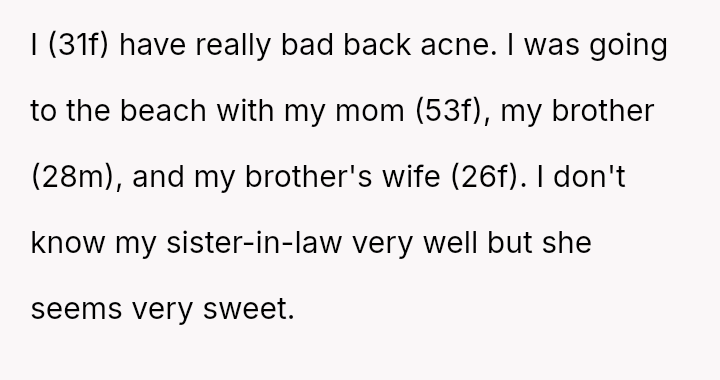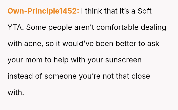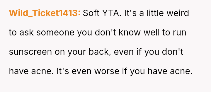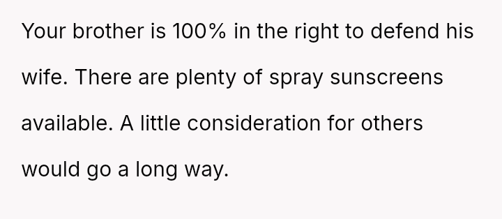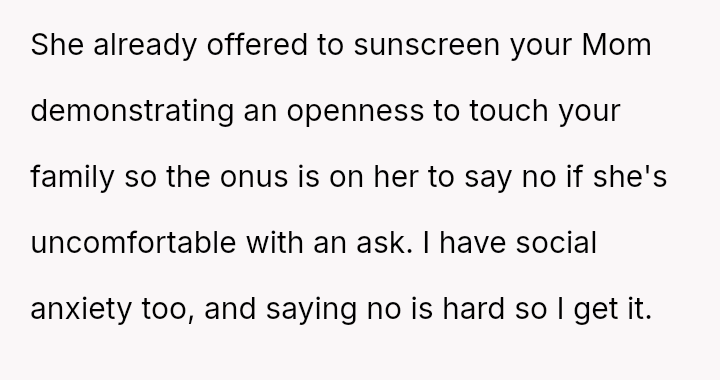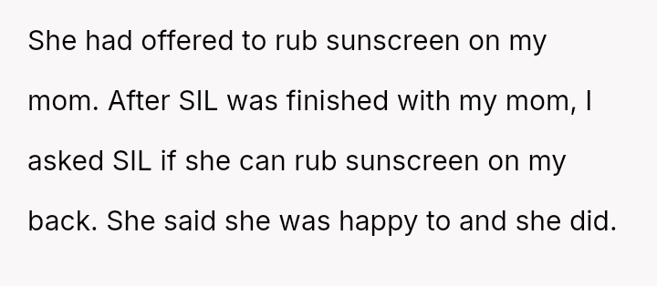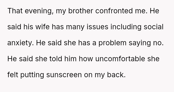 Was the OP wrong for asking for a*sistance with sunscreen application when the sister-in-law (SIL) had already offered help to others, or was the brother justified in confronting OP based on his understanding of his wife's anxiety and comfort levels? Readers must weigh the need for a*sistance against the potential social discomfort caused.
