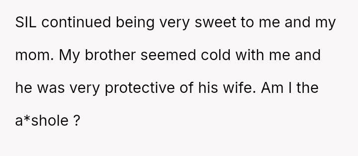 Caught between her brother’s protective instincts and her sister-in-law’s silent struggle, she faces the painful question of empathy and respect.