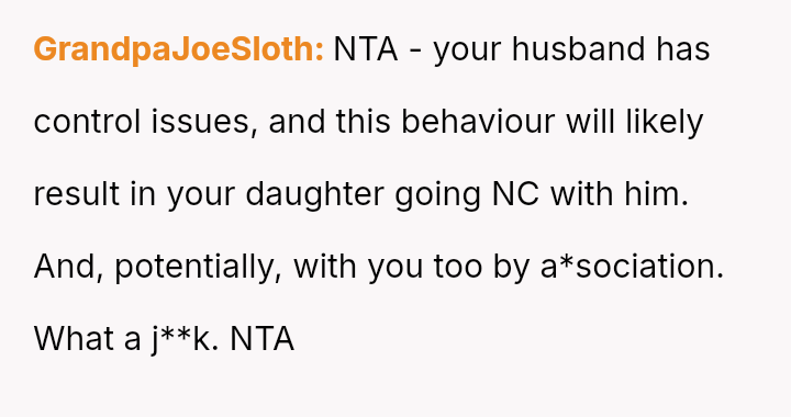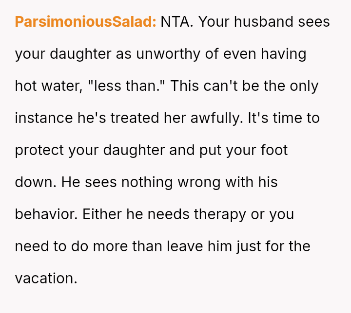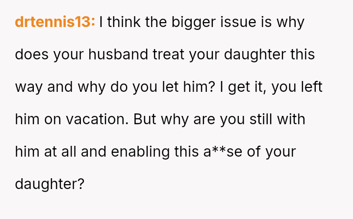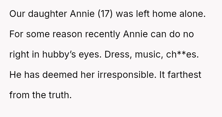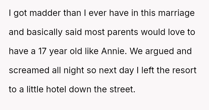 The central conflict lies between the OP's defense of their responsible teenage daughter and the husband's es**blished pattern of finding fault, which escalated into a major marital dispute leading to the OP separating from the vacation.