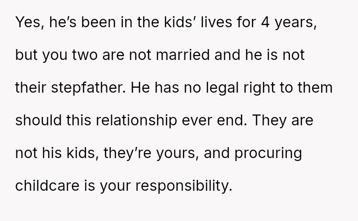 Should a partner be expected to sacrifice planned joint activities when childcare issues arise, even if the children are not biologically theirs?
