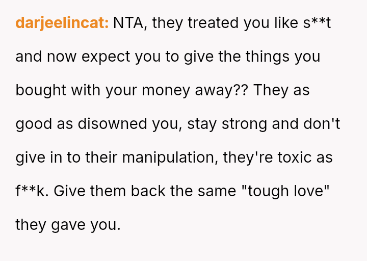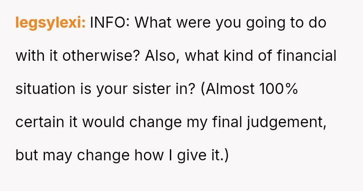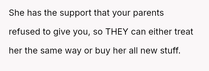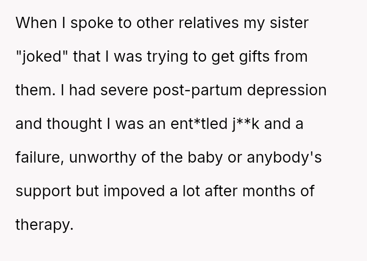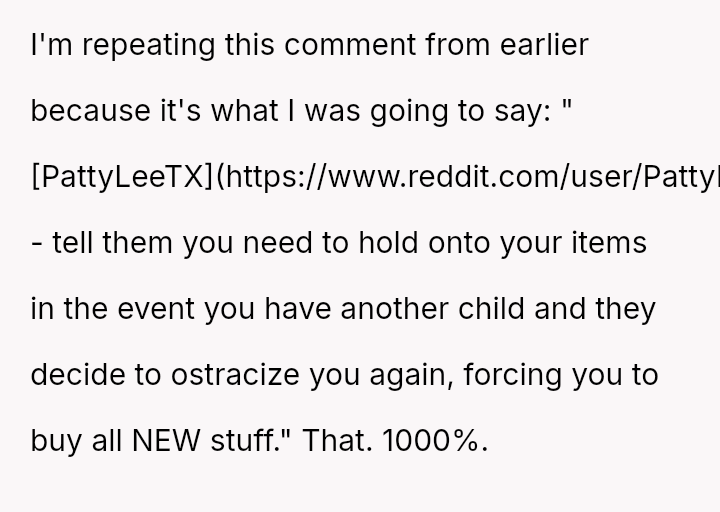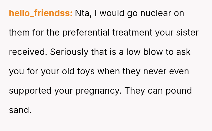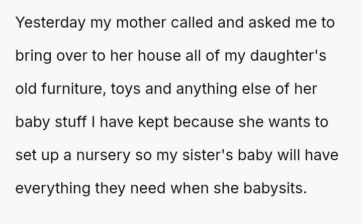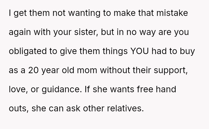 Three years later, her sister is receiving extensive, privileged support, leading the OP to refuse to share her daughter's used baby items.