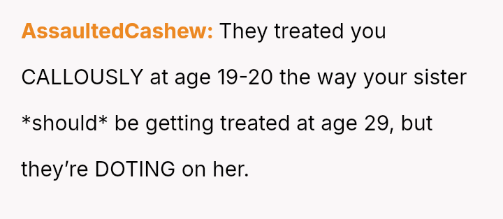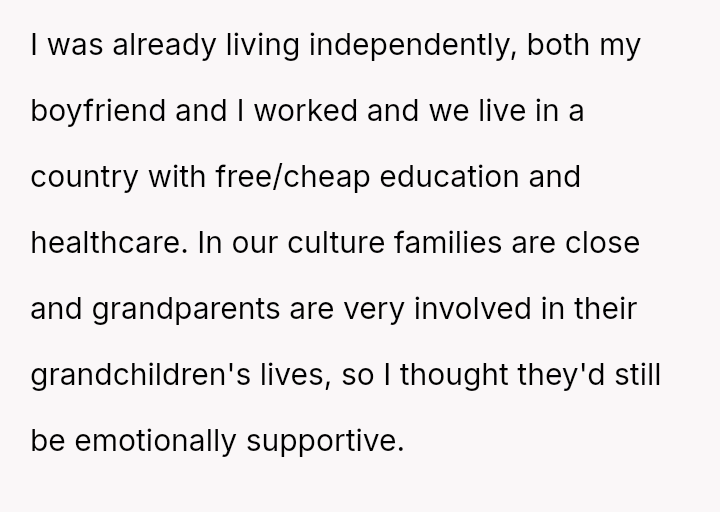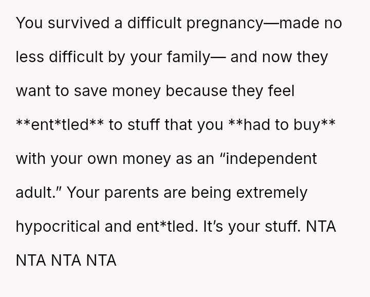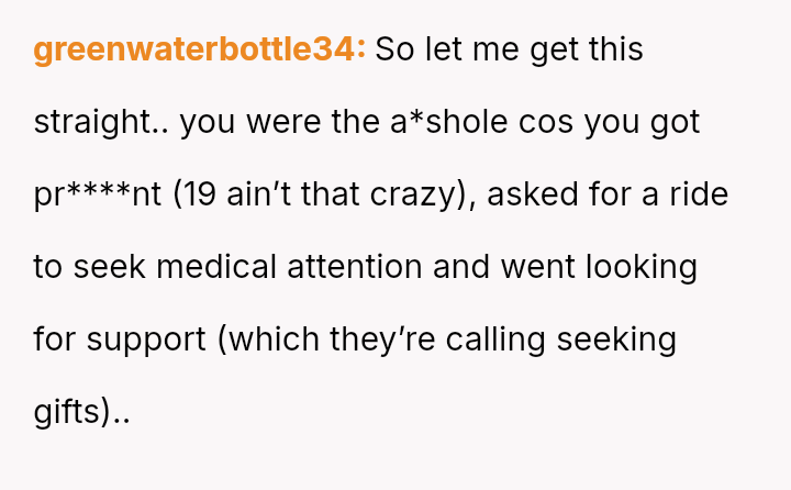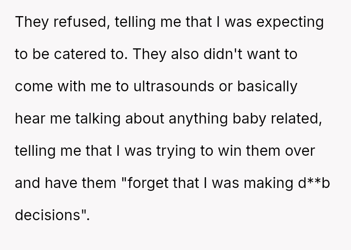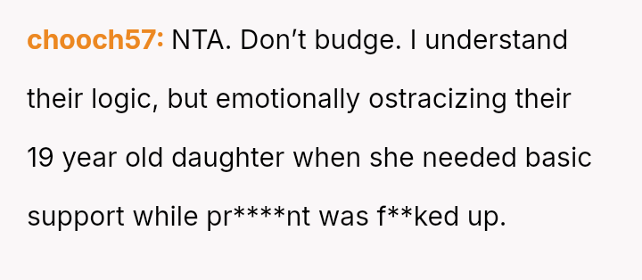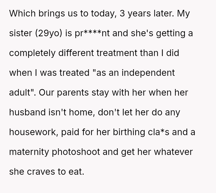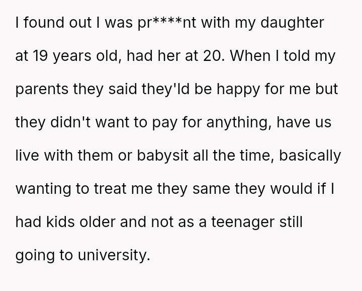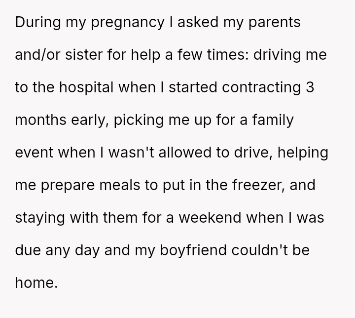 The original poster (OP) experienced a significant lack of emotional and practical support from her family during a vulnerable time—her early pregnancy and postpartum period—while she was treated as an independent adult.