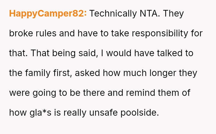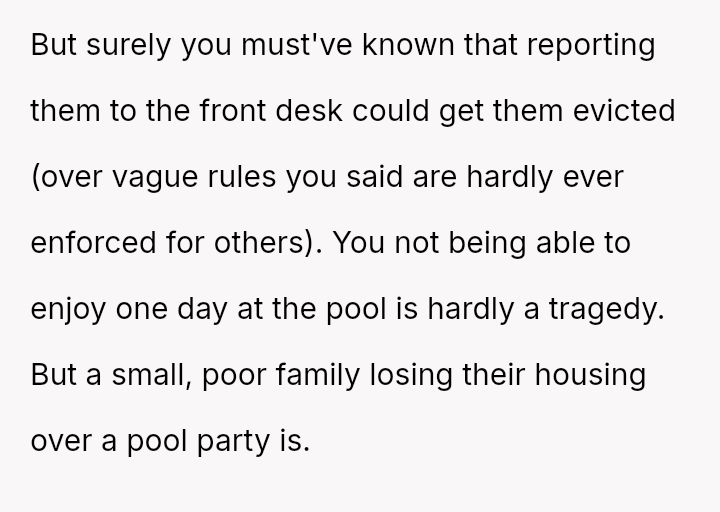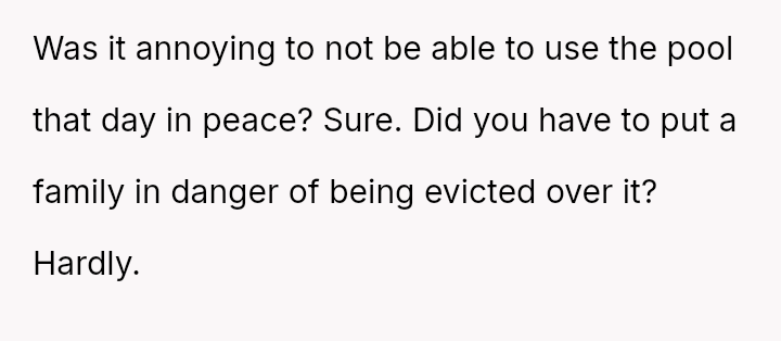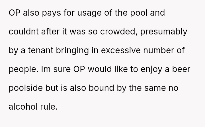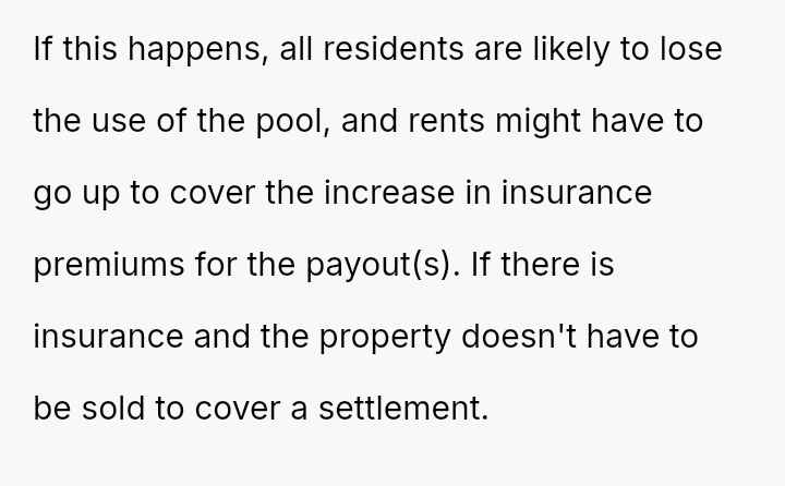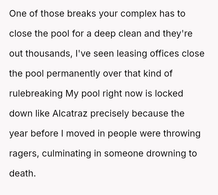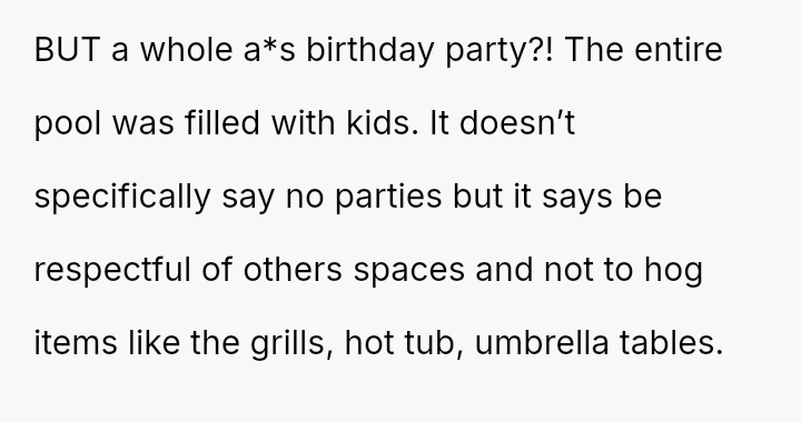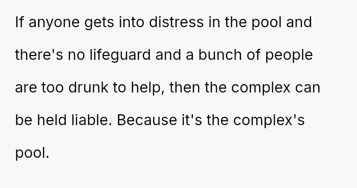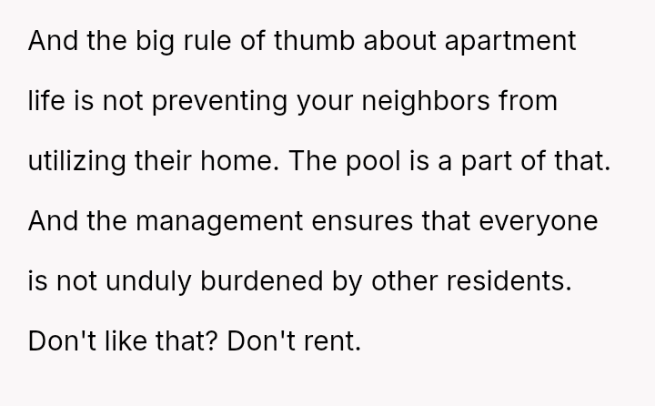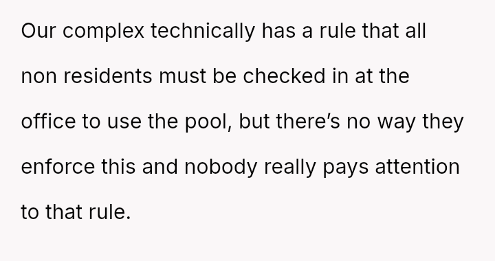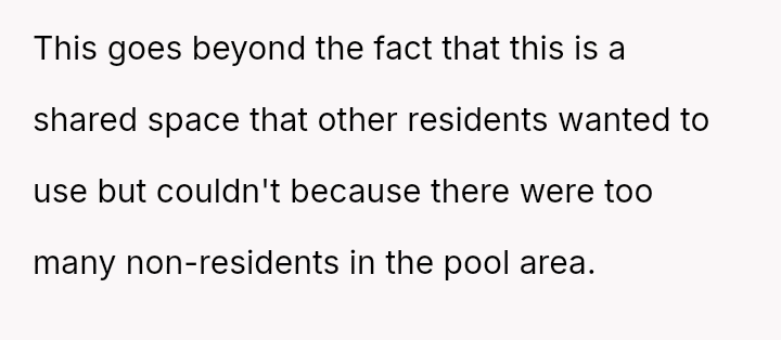 The pool, meant for the residents’ quiet enjoyment, became a battleground for respect and community, highlighting the fragile balance between individual freedom and collective responsibility in shared spaces.