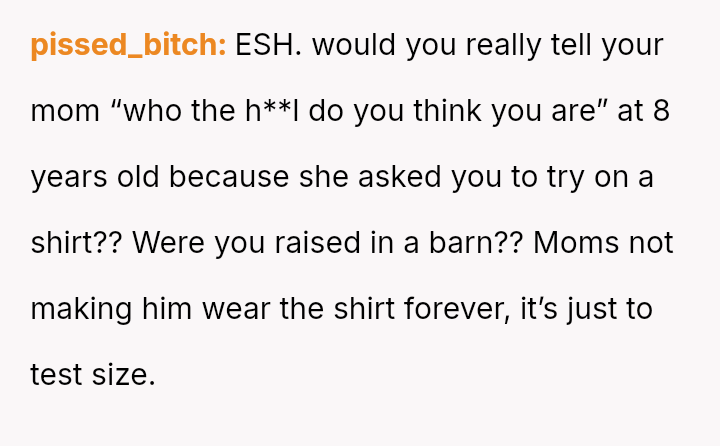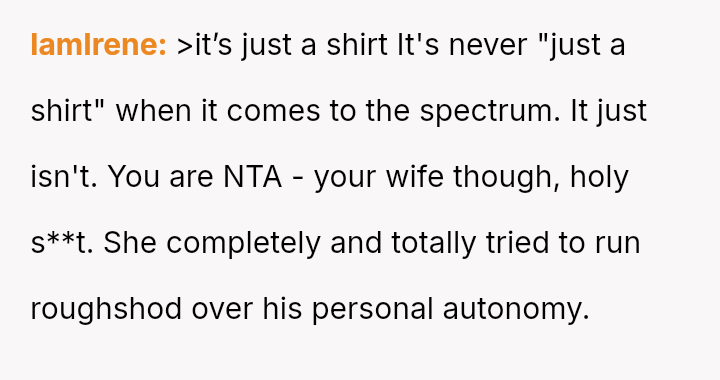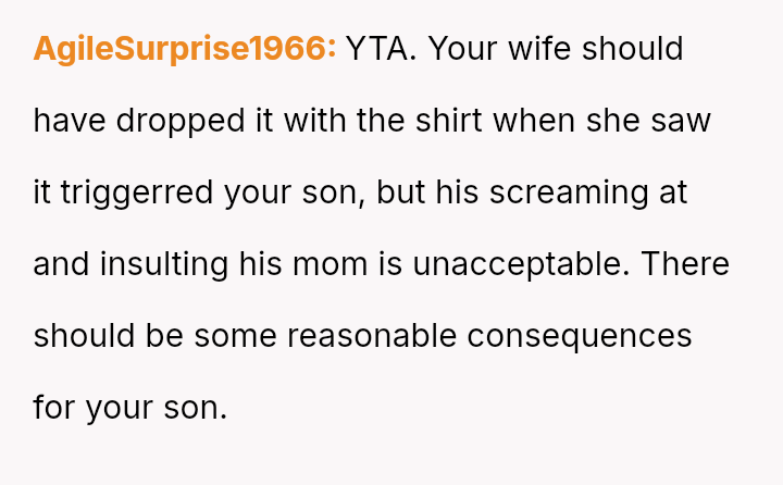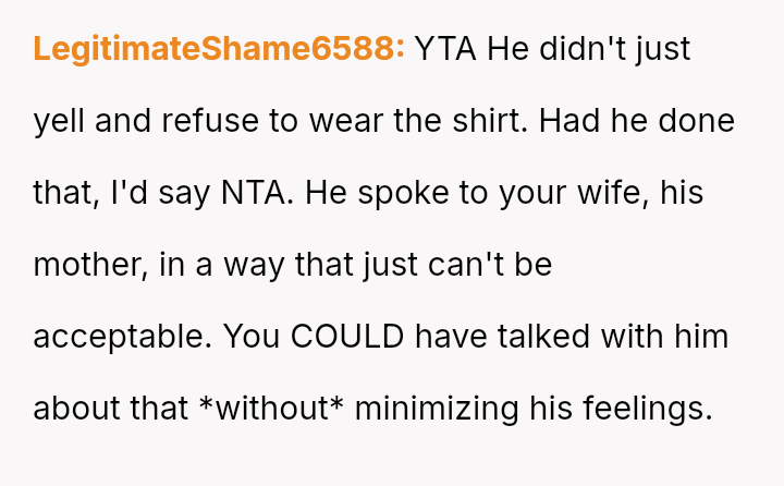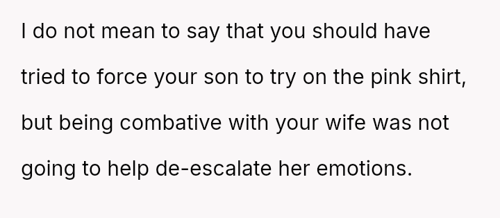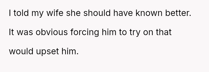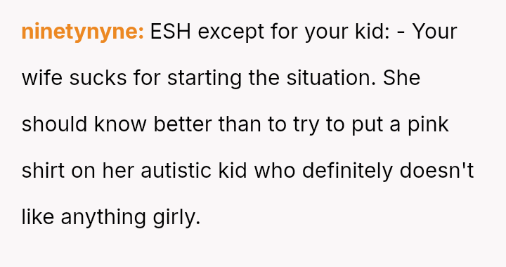 The original poster (OP) is currently in a significant conflict with their wife stemming from an incident where the wife insisted their 8-year-old son try on a girls' shirt, leading to an emotional outburst from the child.