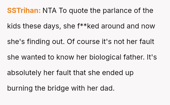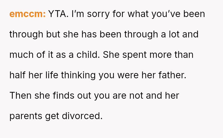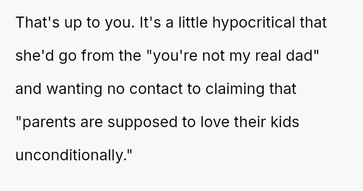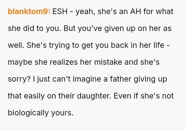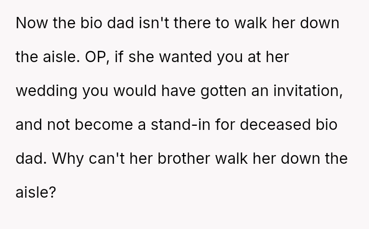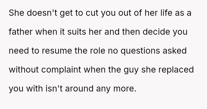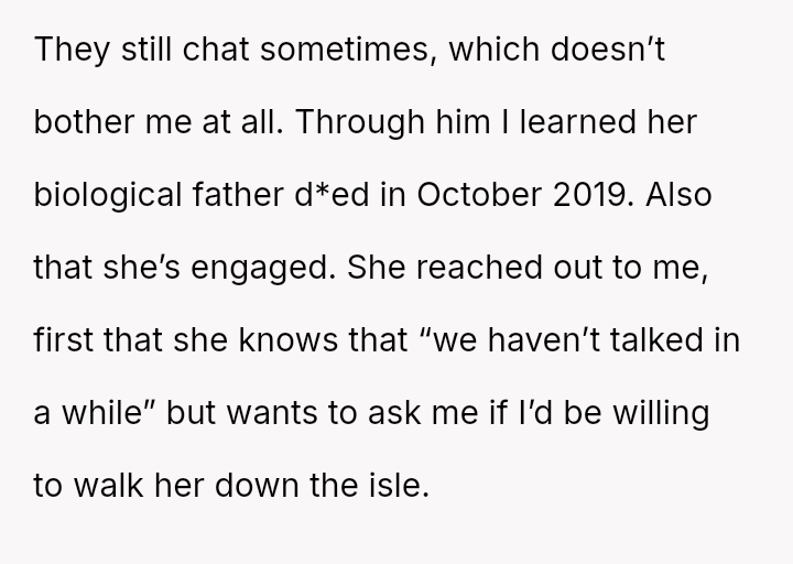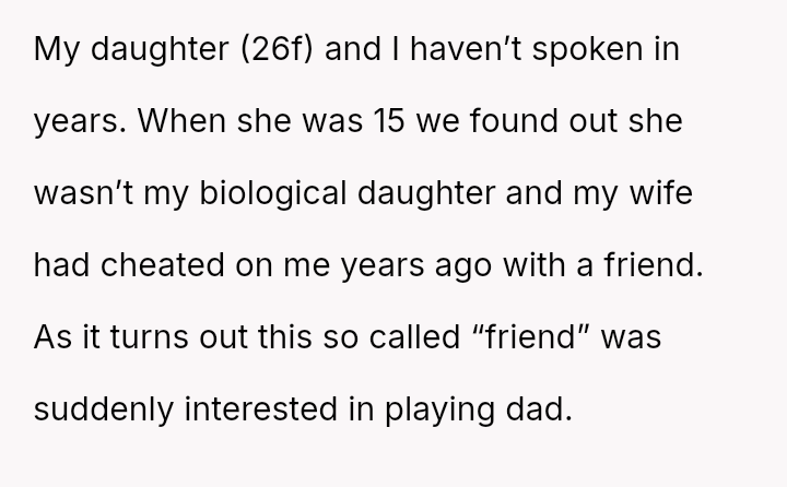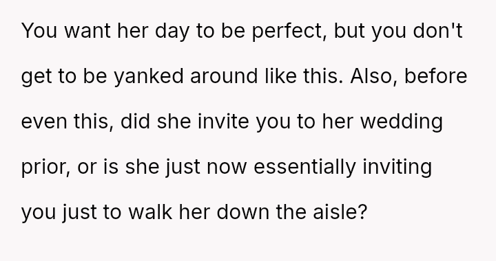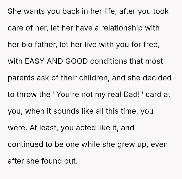 The original poster (OP) is facing a situation where his daughter, who previously rejected him as her father after discovering his non-biological status, now seeks his presence for her wedding.