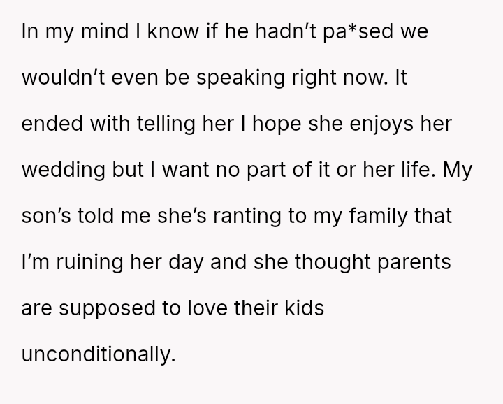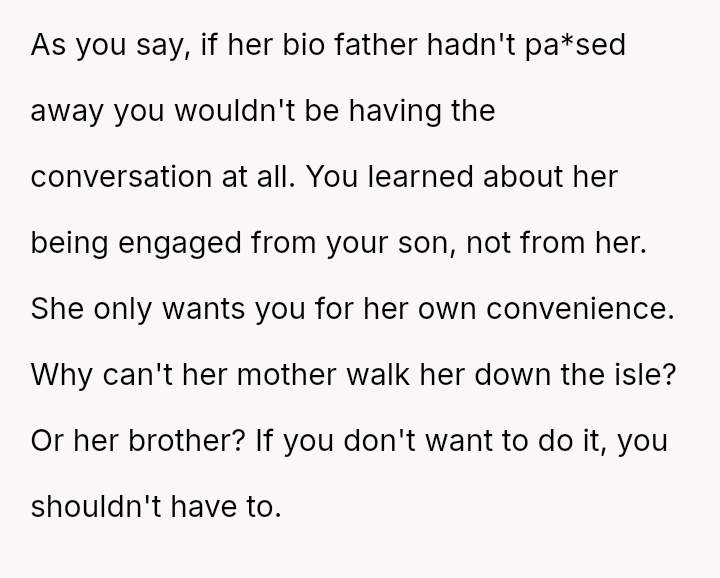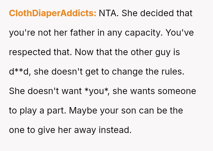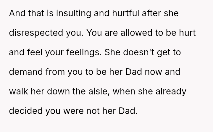 Given the history of emotional abandonment and the daughter's explicit rejection of the parental role when the biological father was available, is the OP justified in refusing to participate in her wedding, or does the societal expectation of unconditional parental love necessitate his presence despite his past hurt?