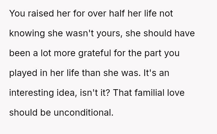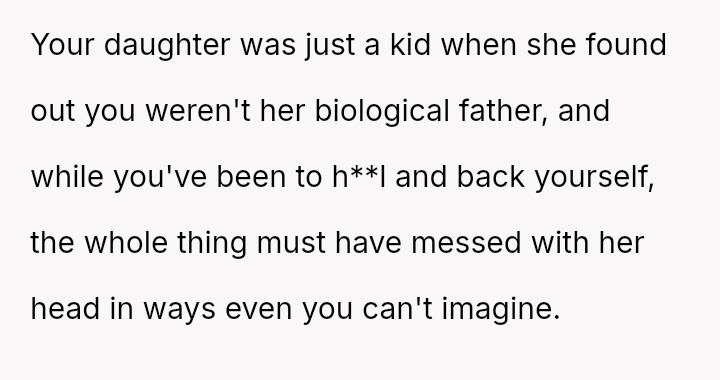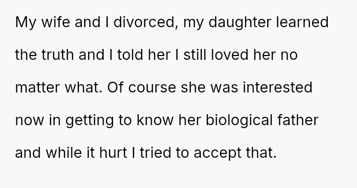 A father's world shattered in an instant when the truth about his daughter's paternity unraveled a deep family bond. Though betrayed by his wife’s in***elity, he clung to the love for the girl he raised, hoping their bond could transcend biology. Yet, the revelation planted a seed of distance, growing into a painful chasm between them.