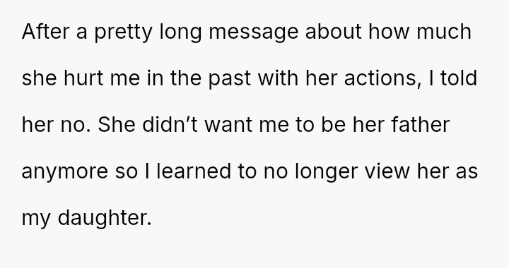 The central conflict lies between the OP's es**blished boundary, based on years of emotional rejection and pain caused by his daughter's choices, and the daughter's expectation of unconditional parental support, especially concerning a significant life event.