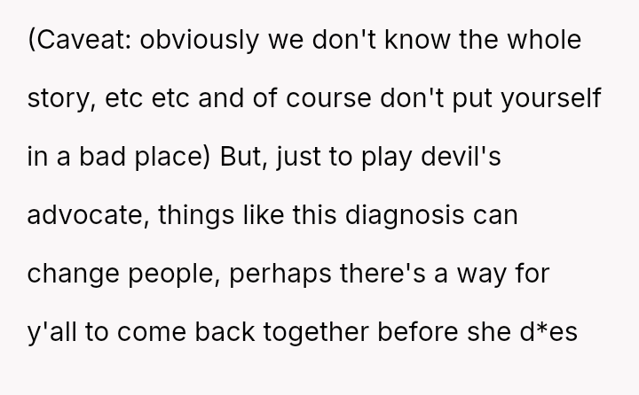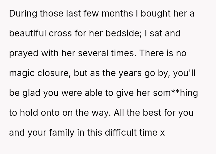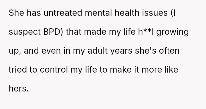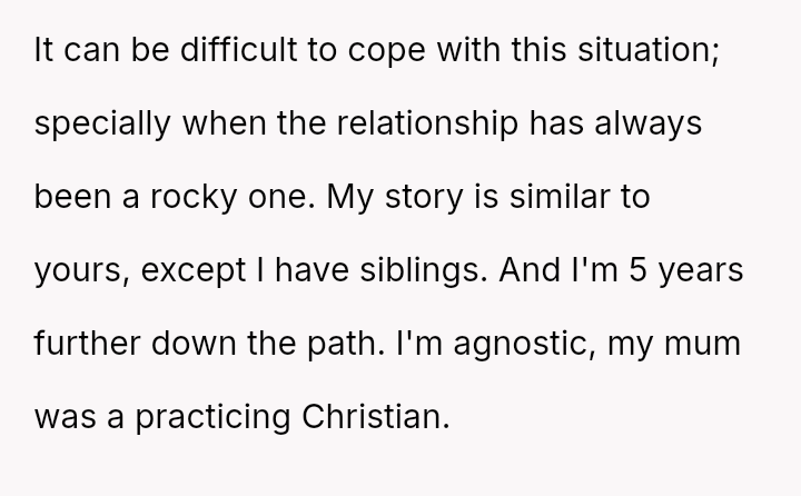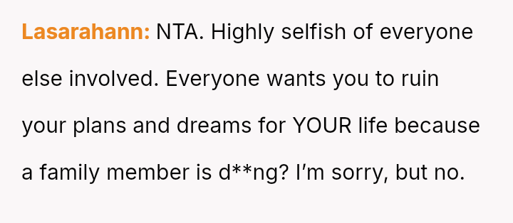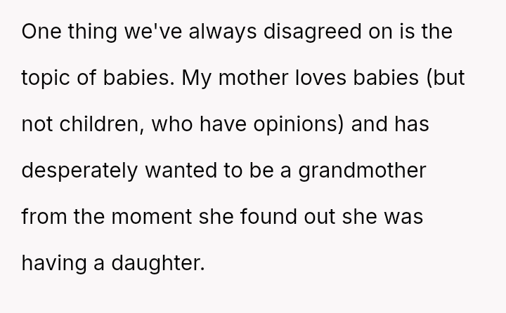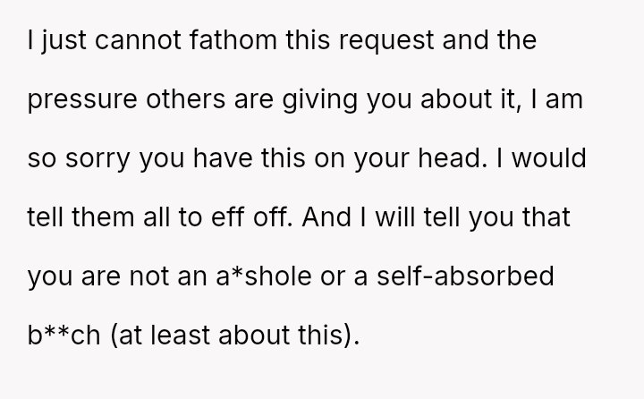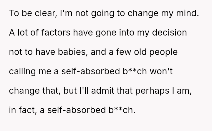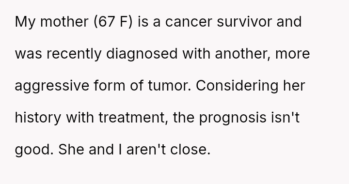 Given the OP's es**blished boundaries and personal decision, is the expectation from the mother and her friends that the OP sacrifice their life choice for the mother's d**ng comfort reasonable, or does the fundamental right to bodily autonomy and life planning supersede the emotional needs of a terminally ill relative?