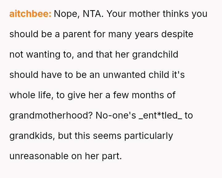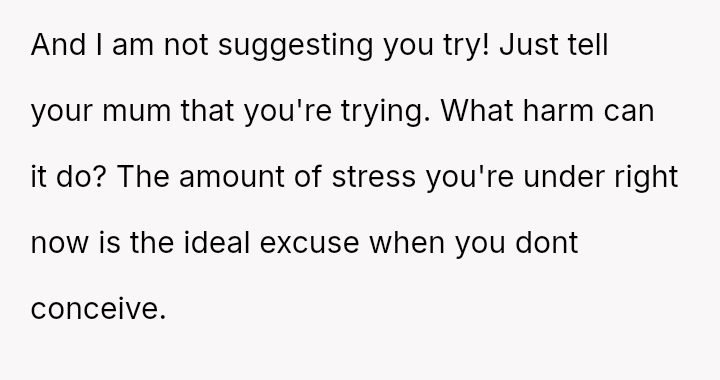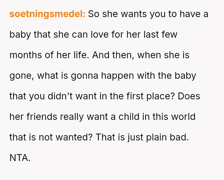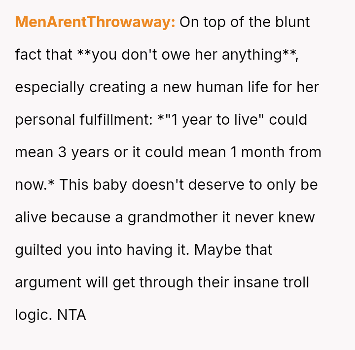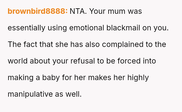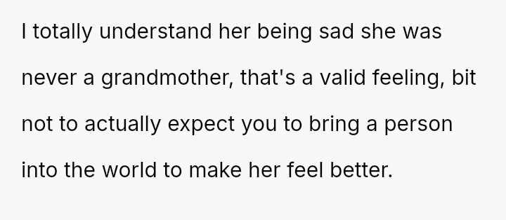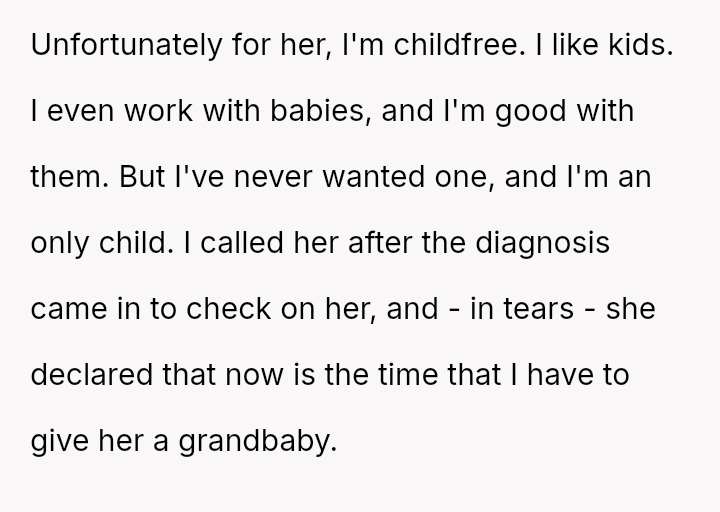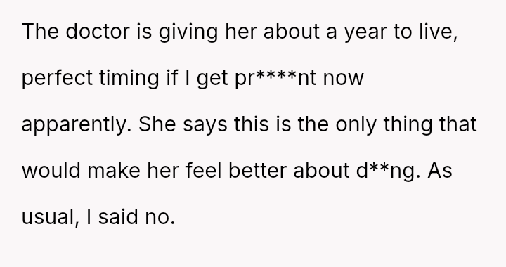 The original poster (OP) is facing immense emotional pressure from their d**ng mother and her social circle, who are demanding the OP have a child to fulfill the mother's final wish.