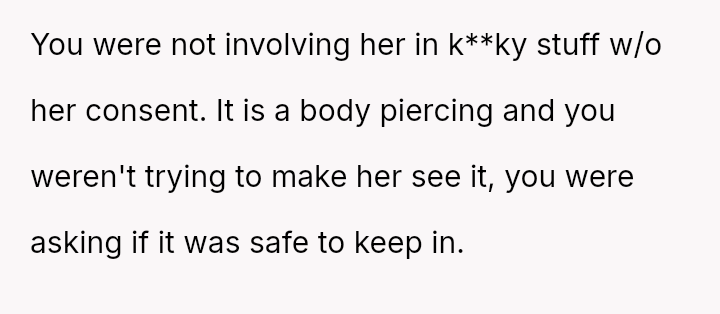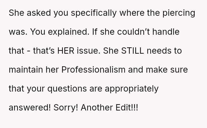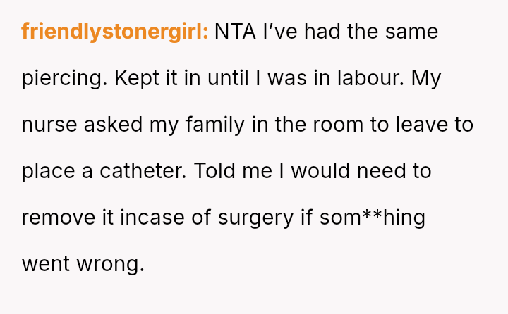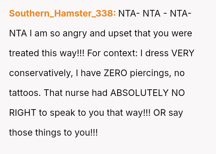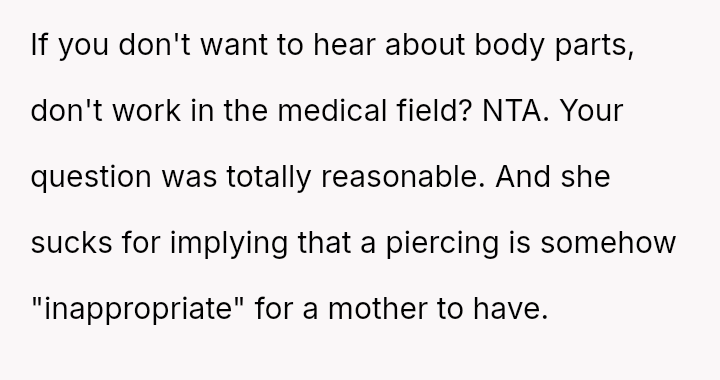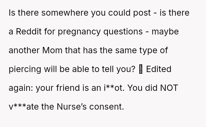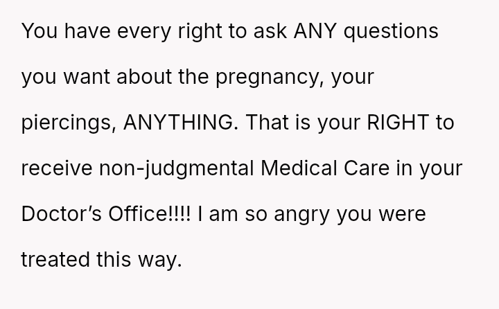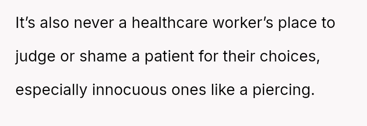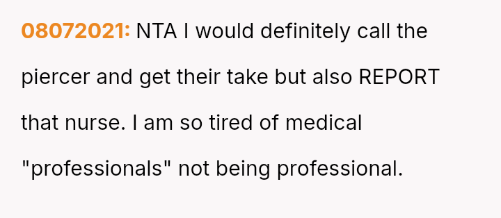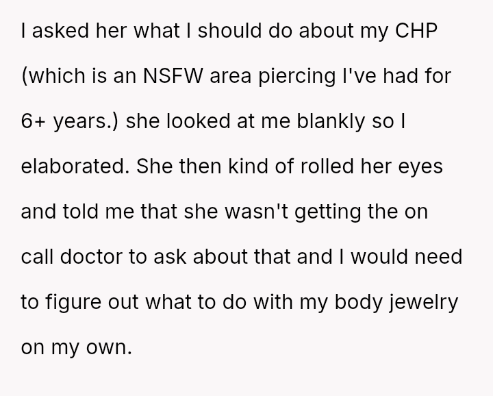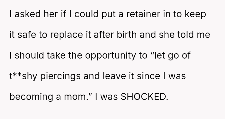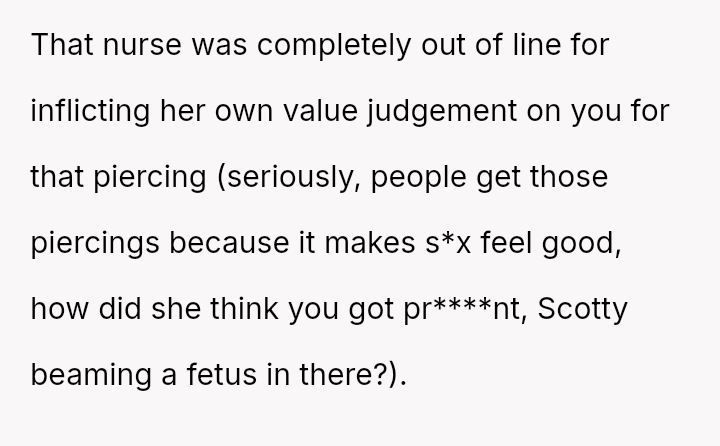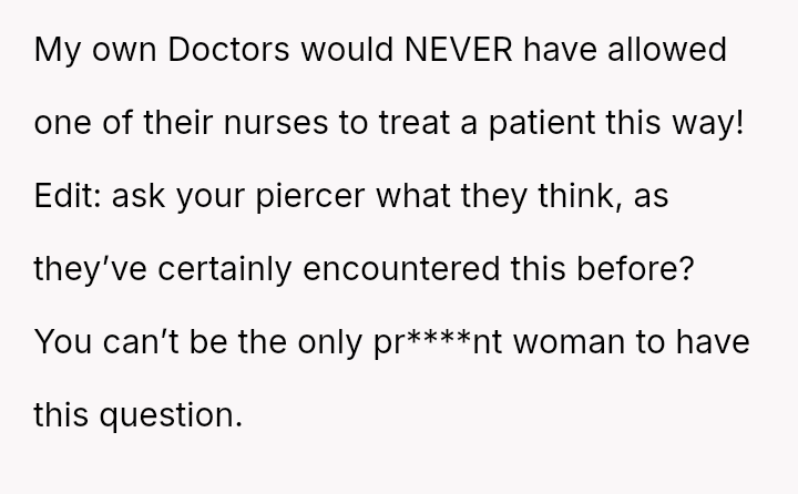 The original poster (OP) faced an unexpected and highly judgmental response from a nurse regarding a personal medical question about a body piercing during pregnancy.