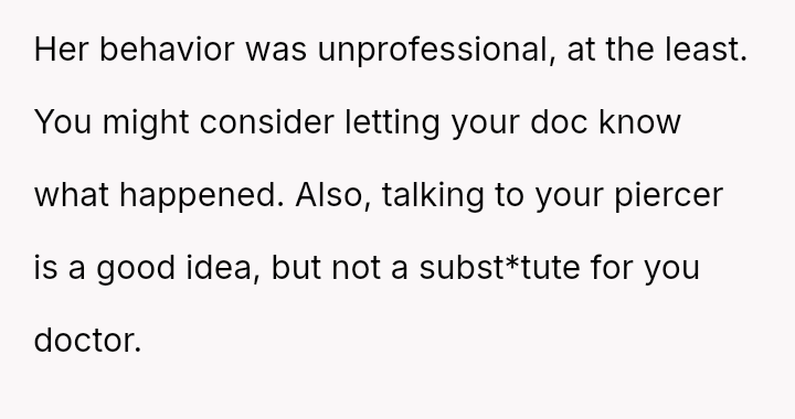 The OP felt ent*tled to professional medical advice from the clinic staff they were visiting, leading to a conflict when the nurse refused to relay the question and instead offered unso***ited personal criticism about the piercing itself.