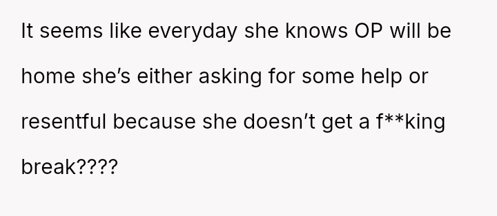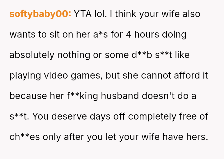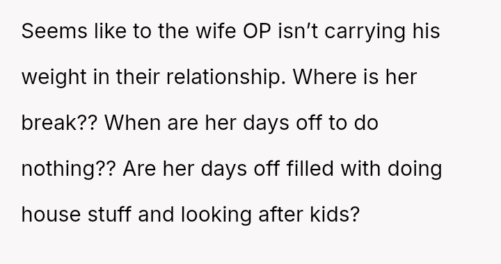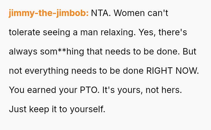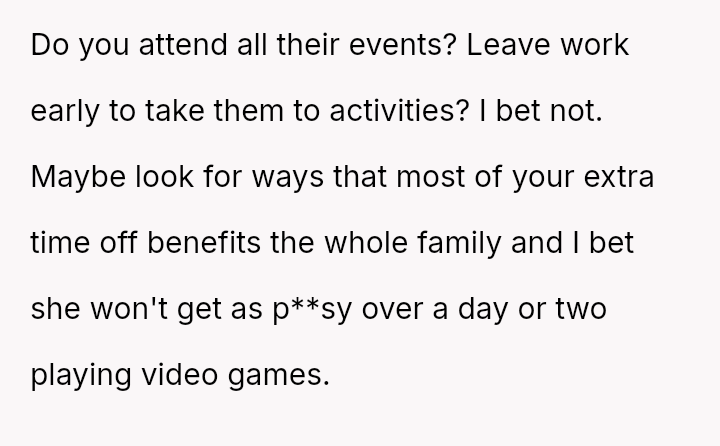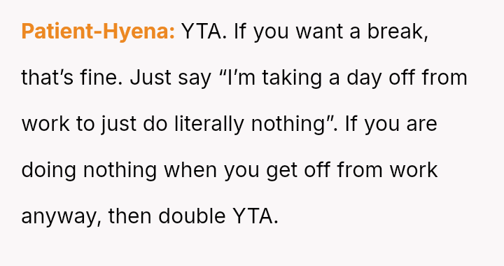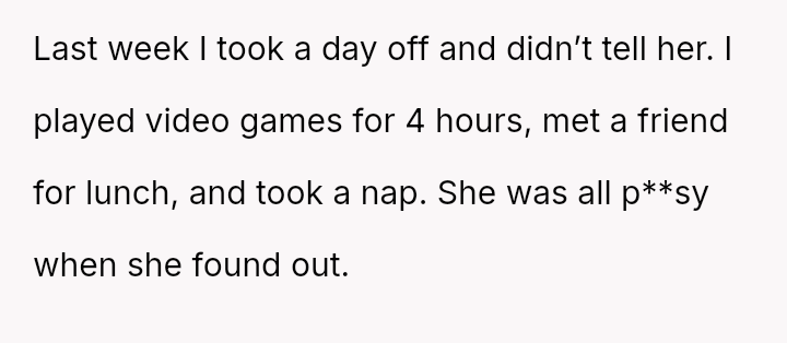Because of this pattern, the OP recently took a day off without telling his wife, using the time to play video games, have lunch with a friend, and nap.