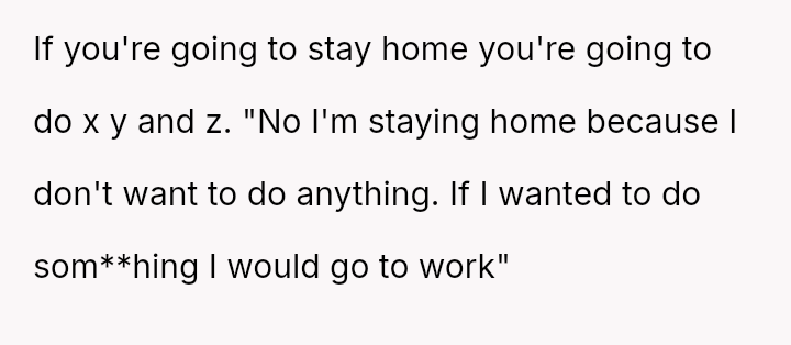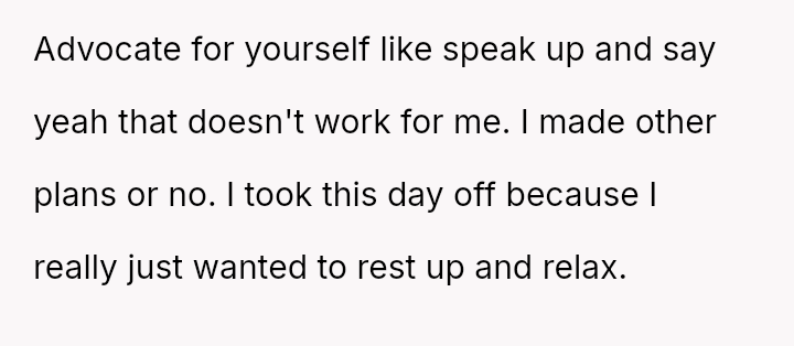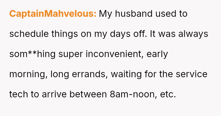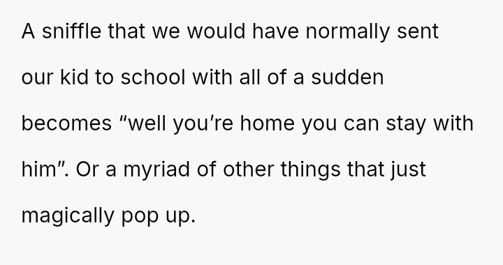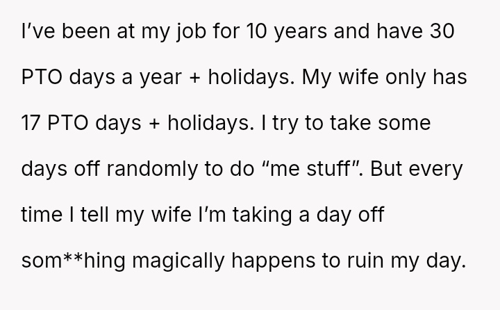 The OP often tries to take random days off for personal time, but whenever he informs his wife, an obligation suddenly appears, such as caring for a slightly sick child or handling a long ch**e.