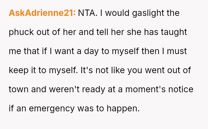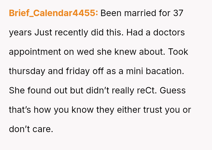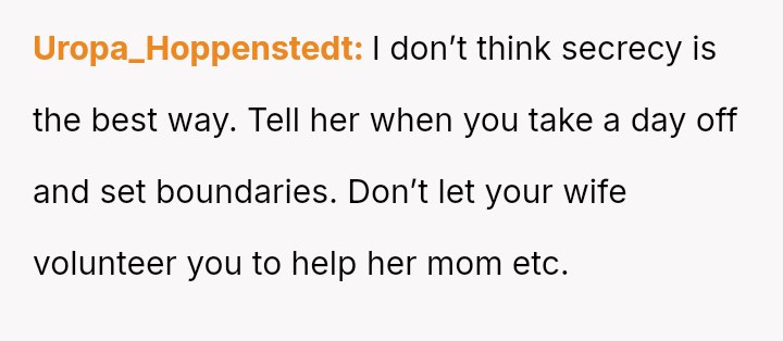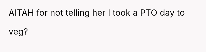 The OP needs to decide if the need for independent rest overrides the expectation of spousal communication and cooperation regarding shared responsibilities; therefore, was the OP justified in taking the day off secretly, or is full transparency required in managing personal time within a marriage?