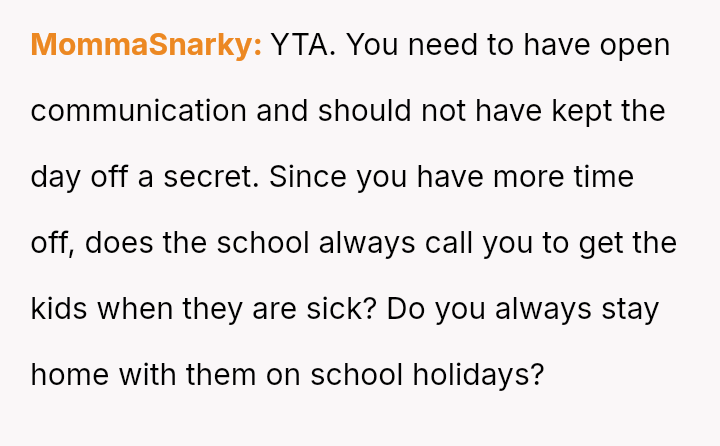 When she found out later, she became upset, leading the OP to question if he was wrong for taking the day without prior notice.