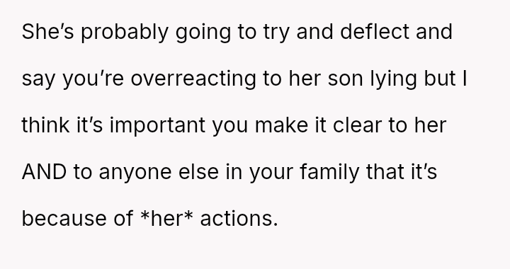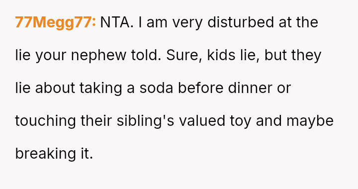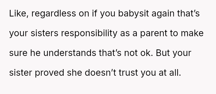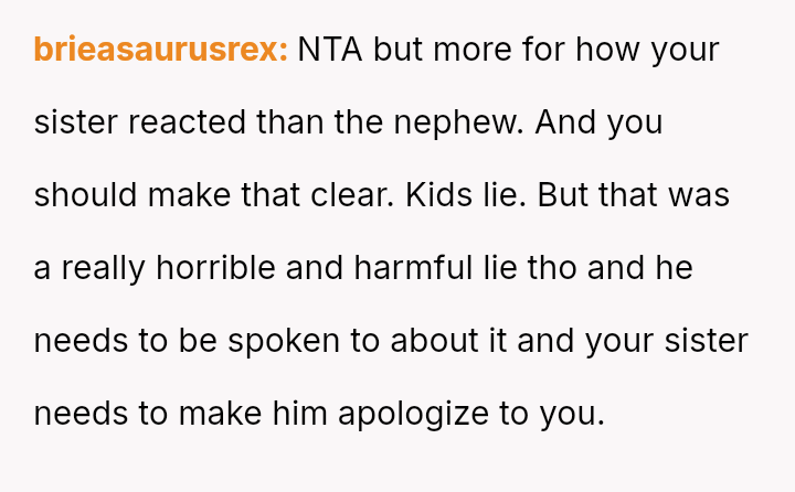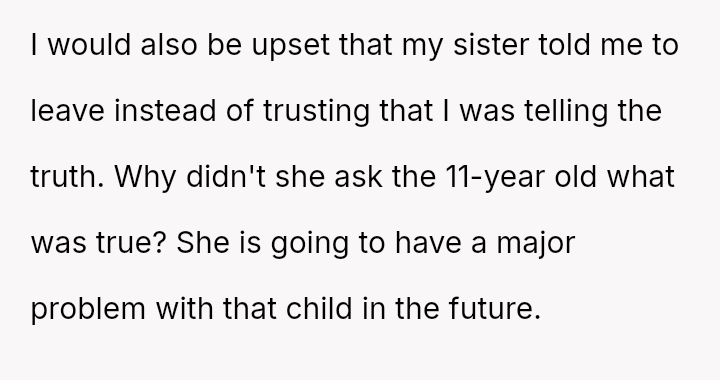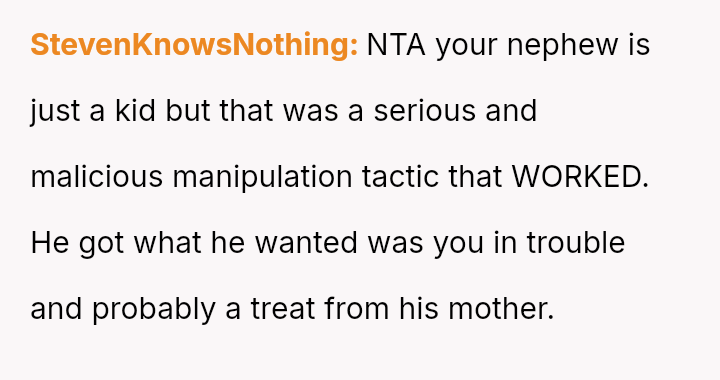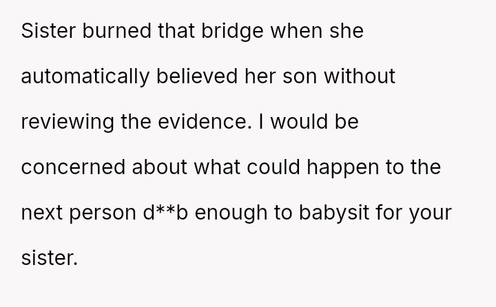 The original poster (OP) experienced a severe breach of trust when their nephew falsely accused them of having an unauthorized man in the house while babysitting, leading to the OP being abruptly told to leave by their sister.