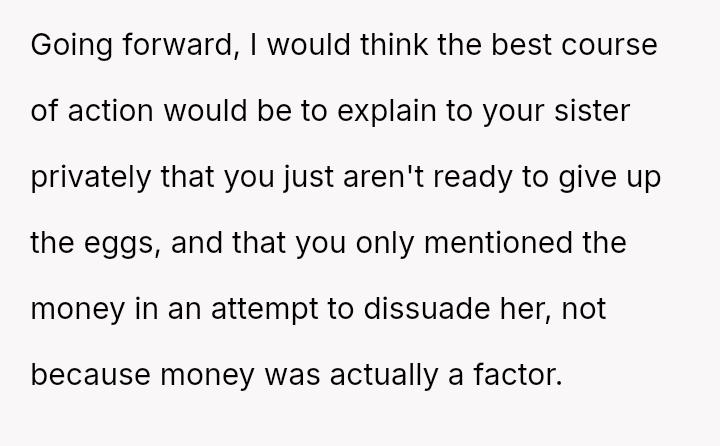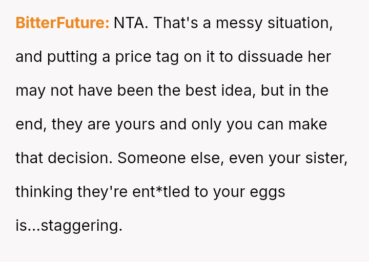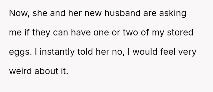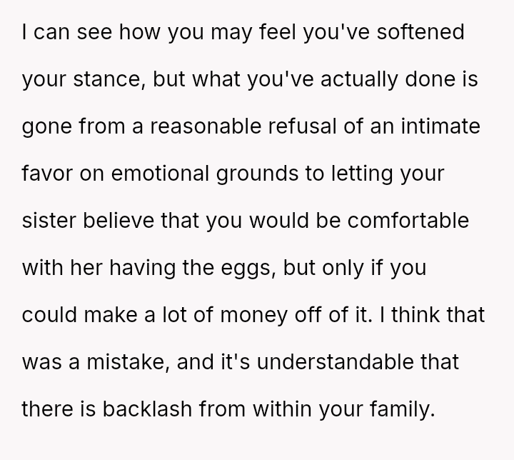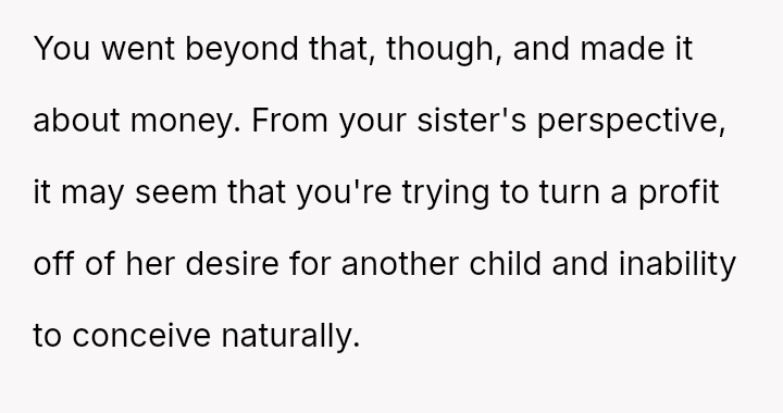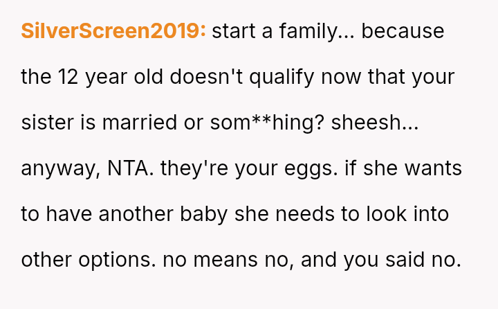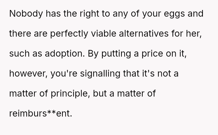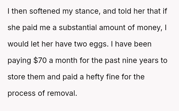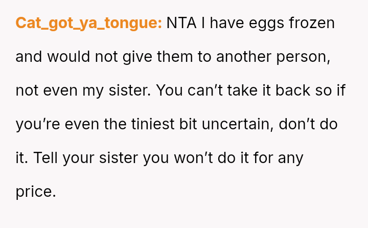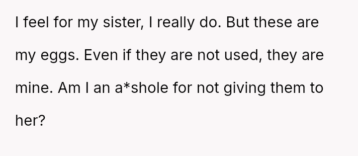 Is the OP justified in refusing to share their personal, stored reproductive material without significant compensation, even when faced with familial shaming and claims that they are responsible for their sister's potential future marital ins**bility, or does the ethical obligation to a*sist a close relative in starting a family outweigh personal autonomy in this specific scenario?