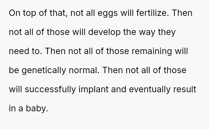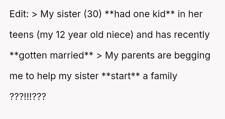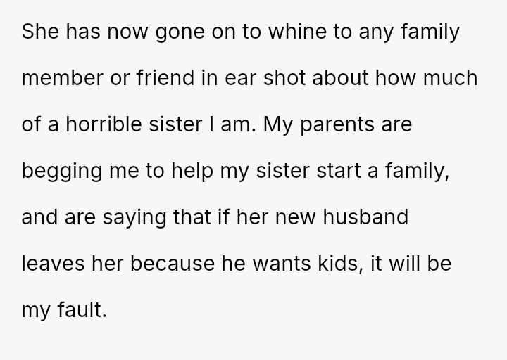The original poster (OP) is facing intense emotional pressure from their sister and parents regarding the use of their frozen embryos, despite the OP having legitimate claims to ownership and significant past financial investment.