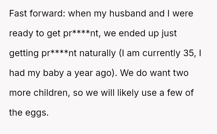 Life, however, unfolded in unexpected ways — a natural pregnancy blessed her, yet the frozen hope remained, a silent promise for the children yet to come.