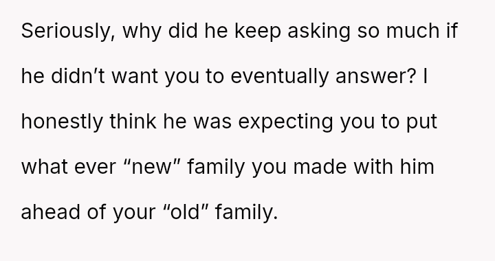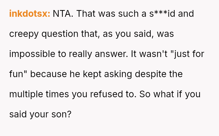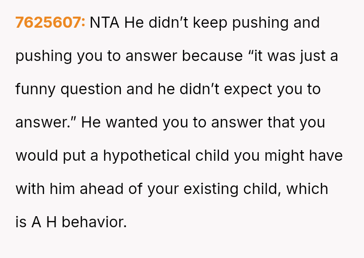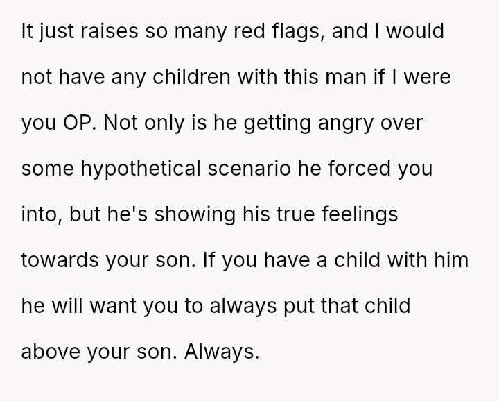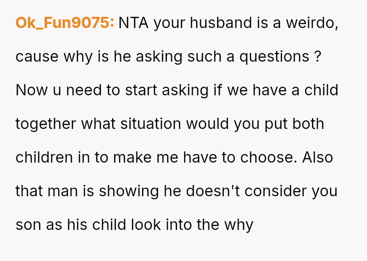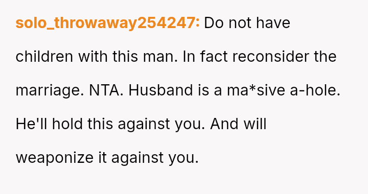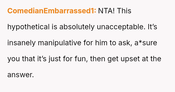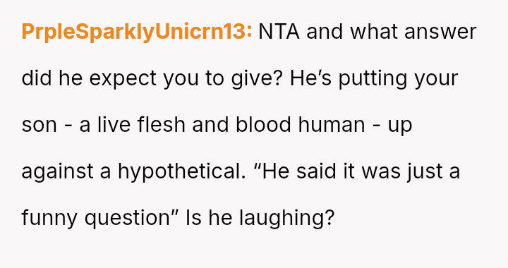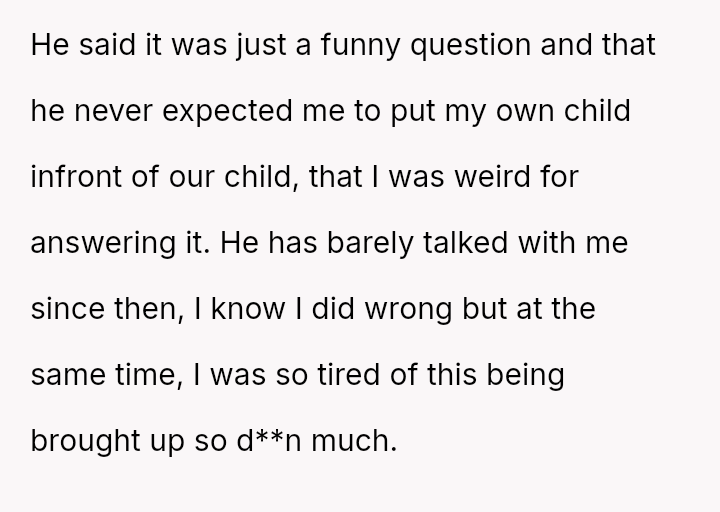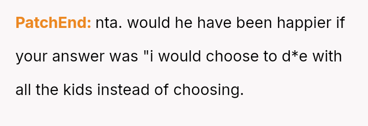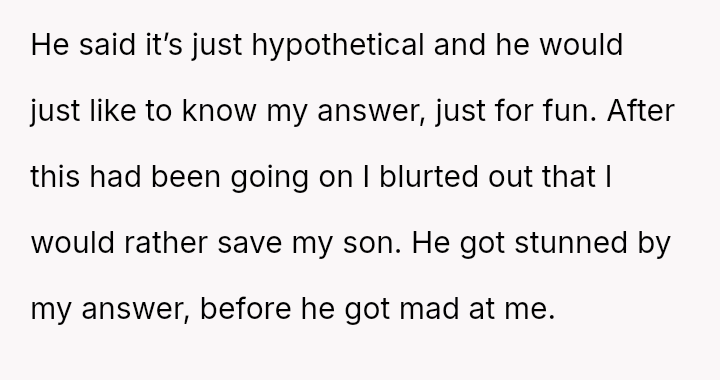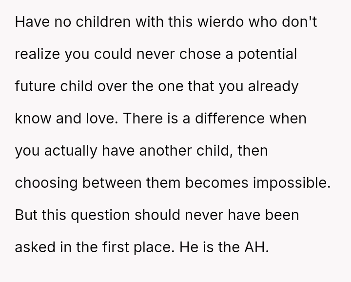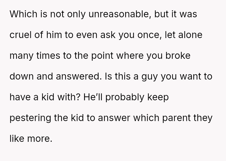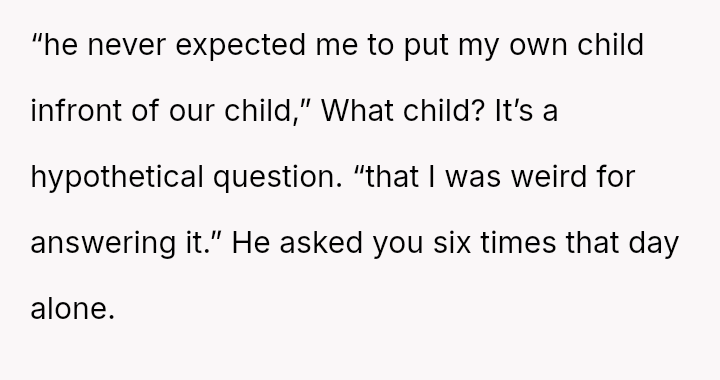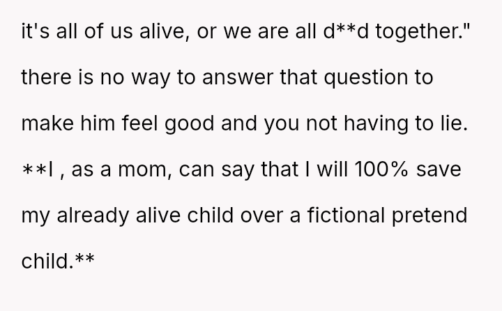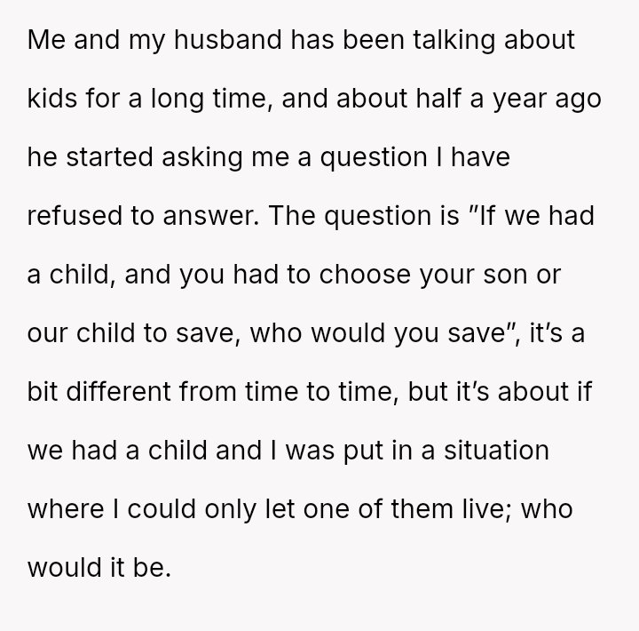 Given the husband's relentless insistence on answering a question that deliberately forces the OP to devalue one child over another, is the pressure applied by the husband the root cause of the conflict, or does the OP's honest, albeit painful, answer reveal an insurmountable incompatibility in their foundational views on parental love?