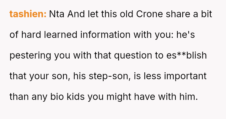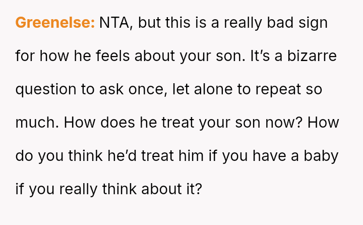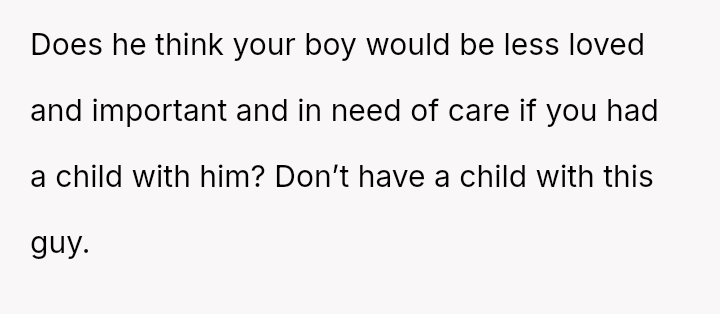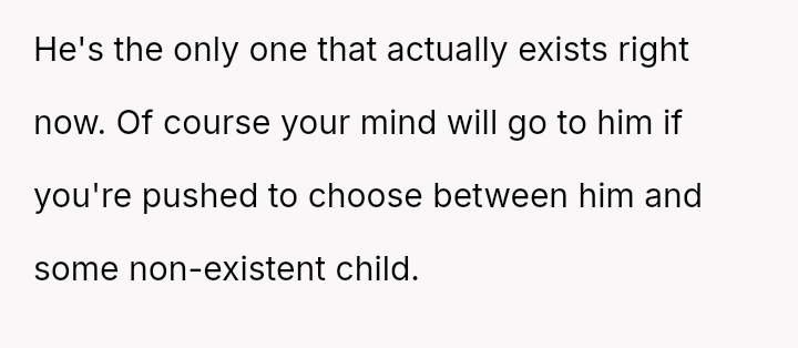 Her central conflict stems from feeling pressured into choosing between her existing son and a potential future child, leading to an answer driven by exhaustion rather than considered preference, which subsequently angered her husband.