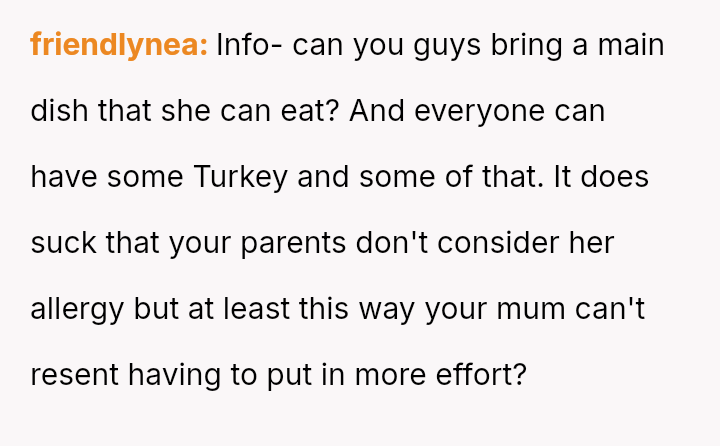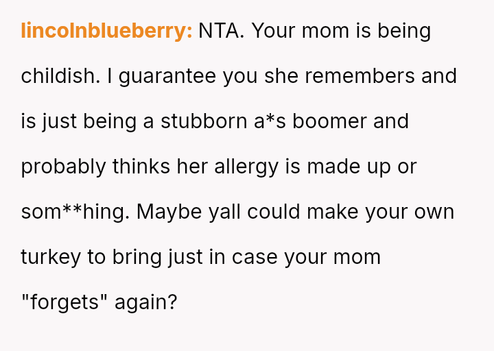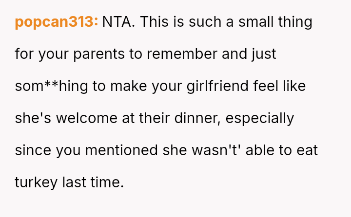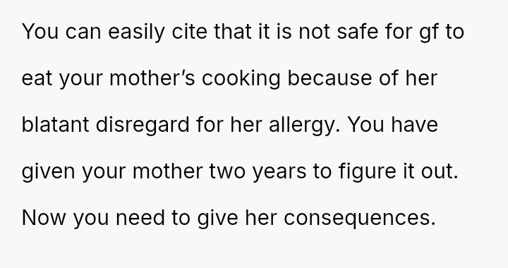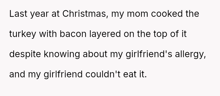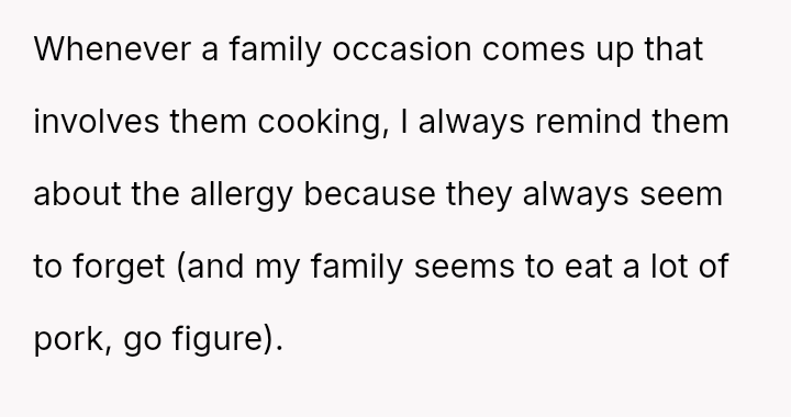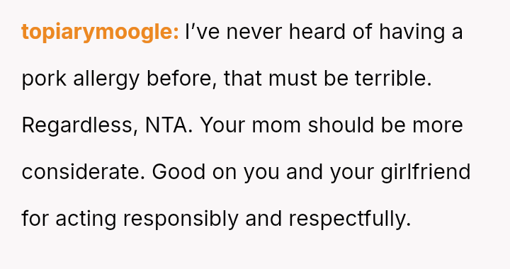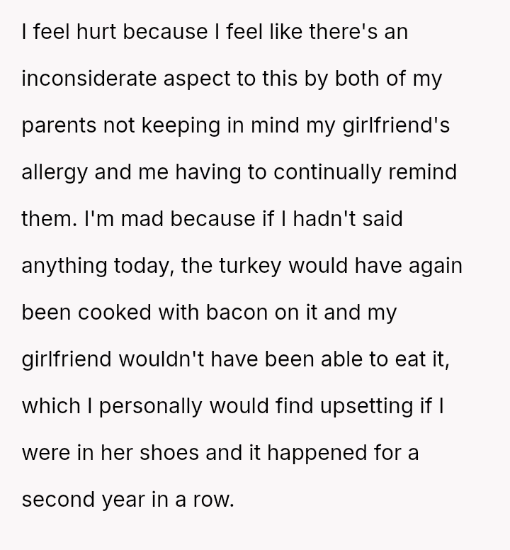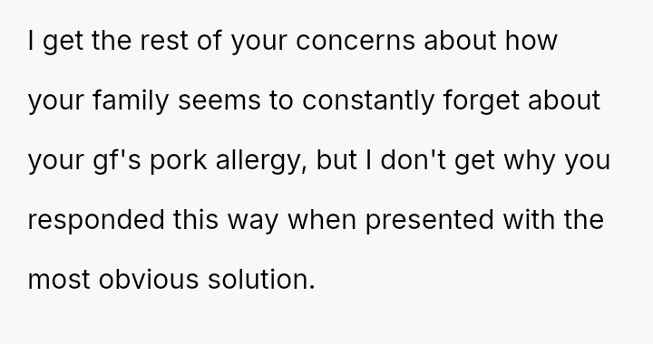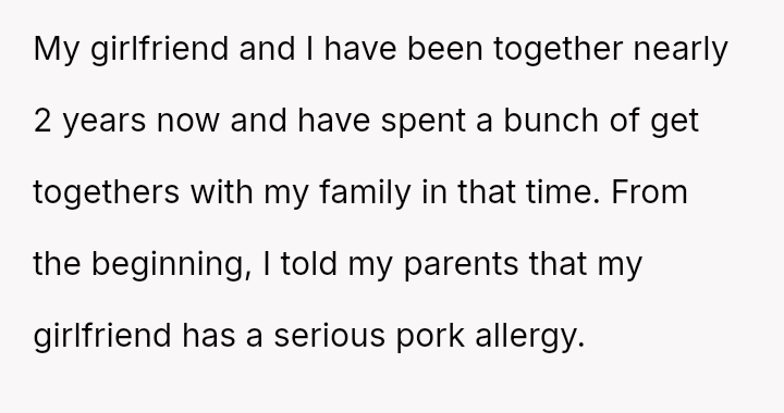 The original poster (OP) is clearly distressed by their parents' repeated failure to respect their girlfriend's serious pork allergy, feeling that they must constantly police their mother's cooking choices.