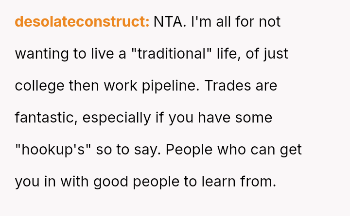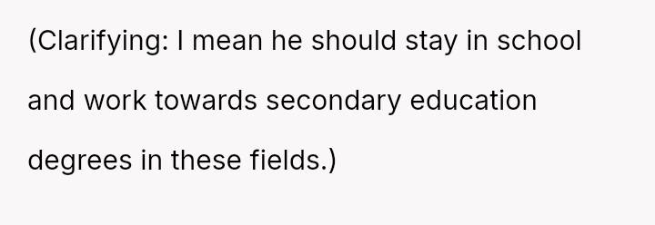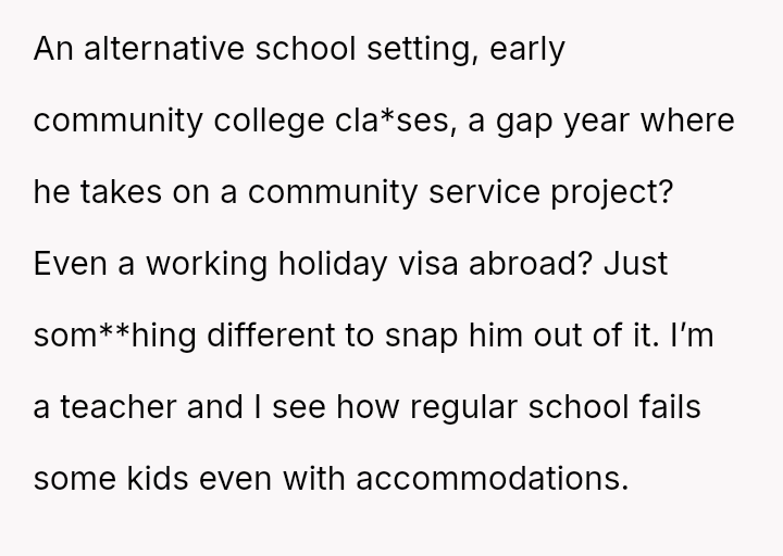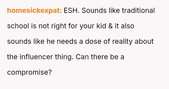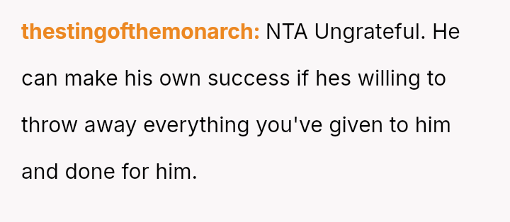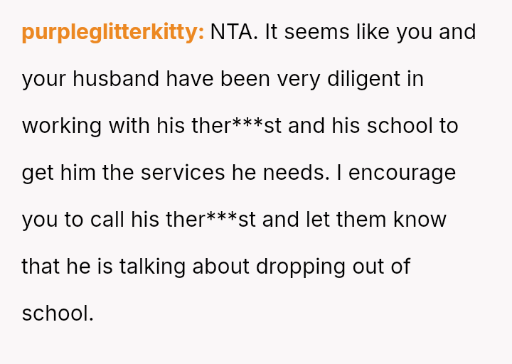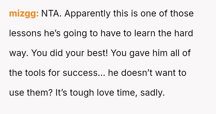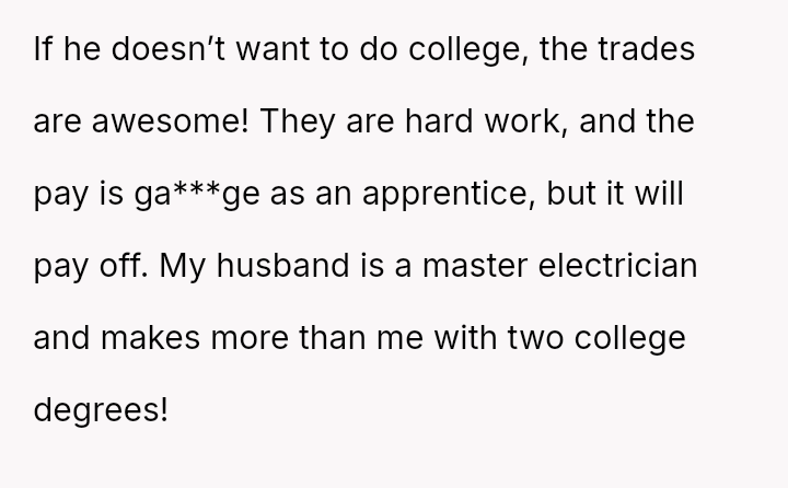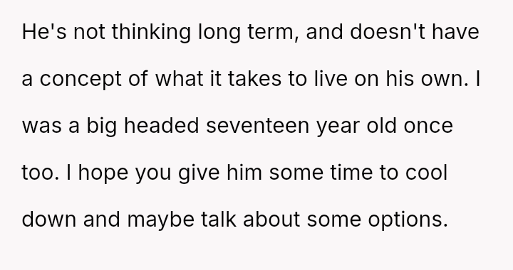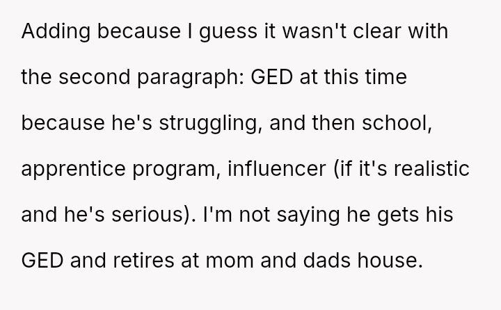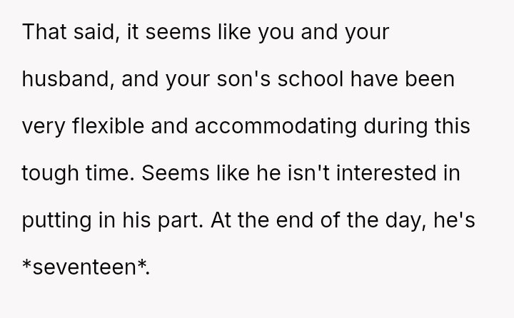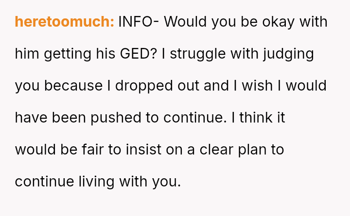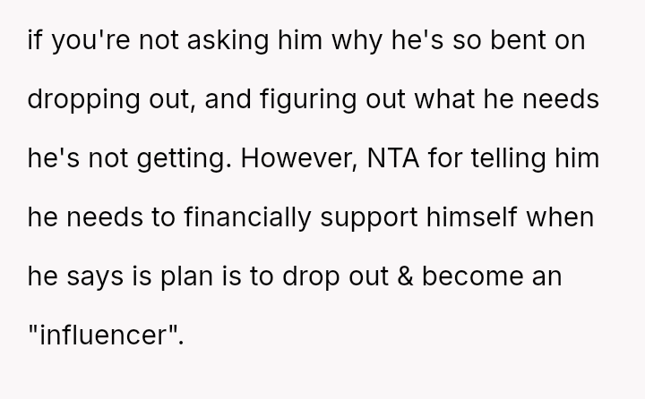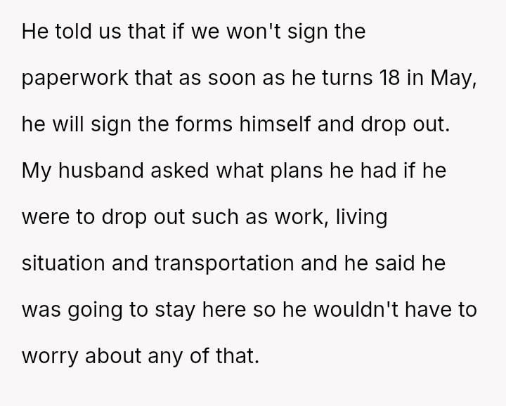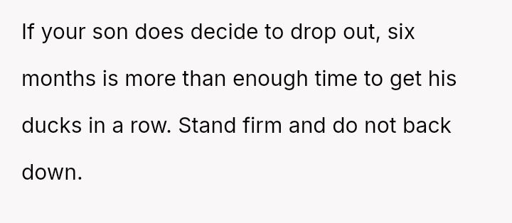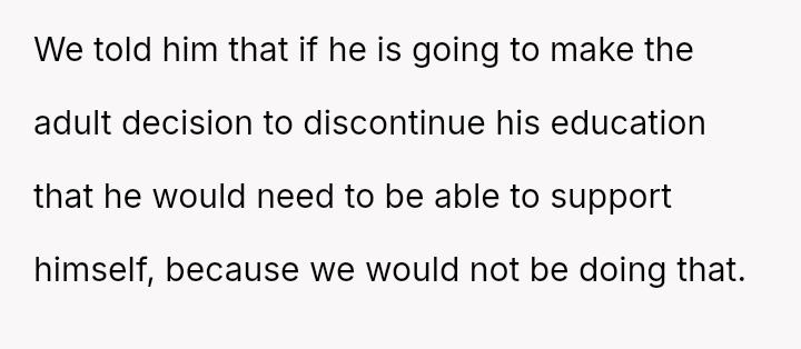 The original poster and her husband are firmly upholding their boundary: their son must either complete his education or become fully independent if he chooses to leave school.