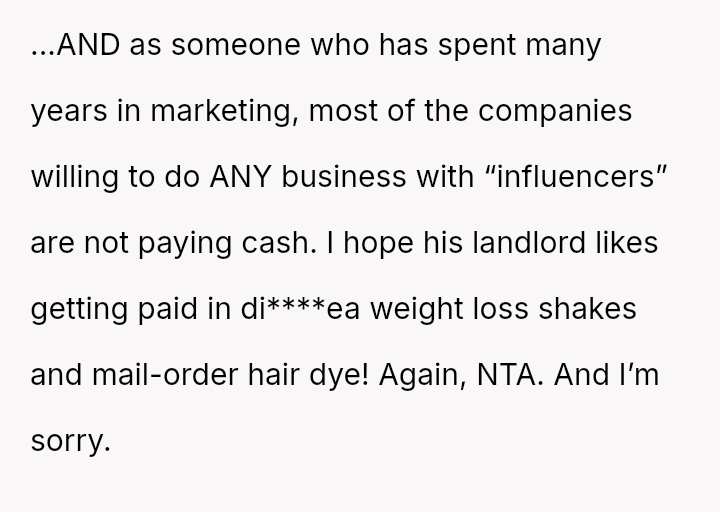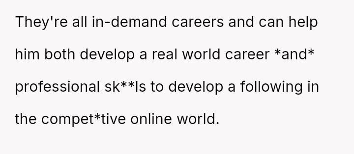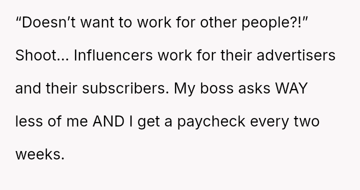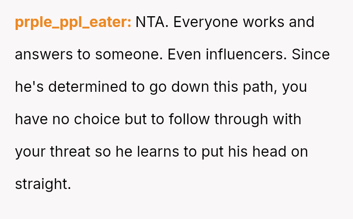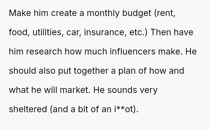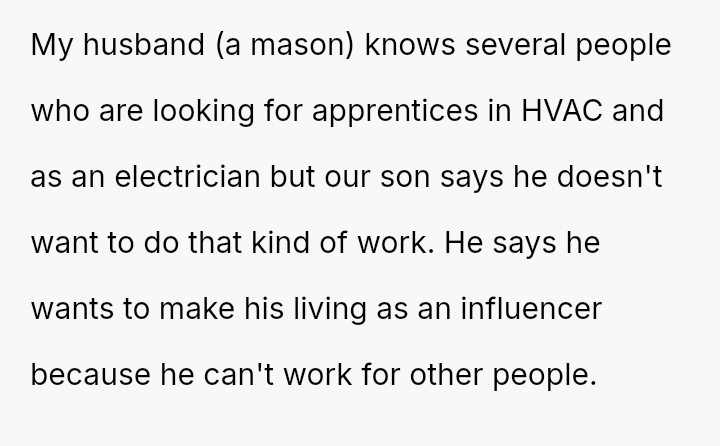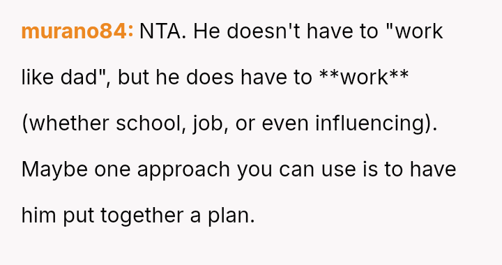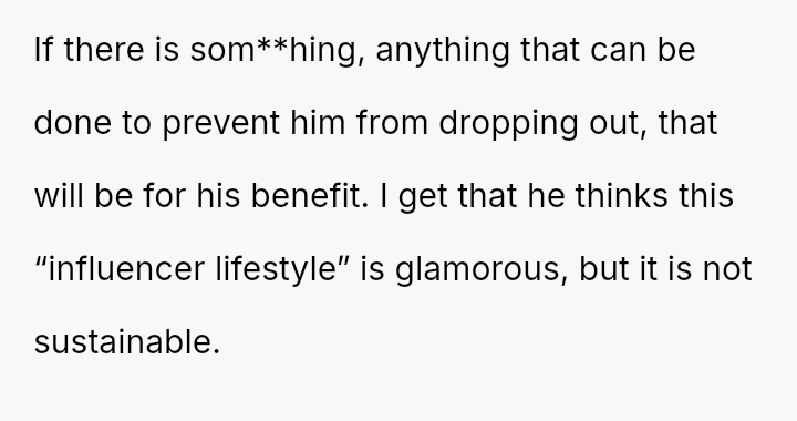 This stance creates a direct conflict with the son's desire to drop out, remain at home without responsibility, and pursue an undefined career as an influencer.