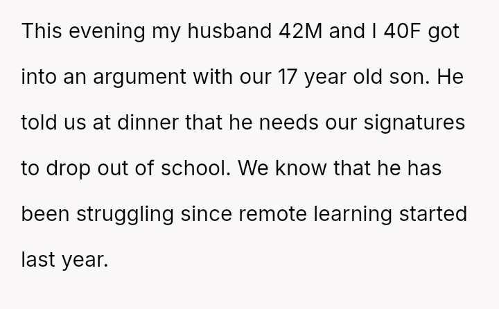 Tensions ran high at the dinner table as a 17-year-old boy dropped a b**bsh**l on his parents: he wanted to drop out of school.