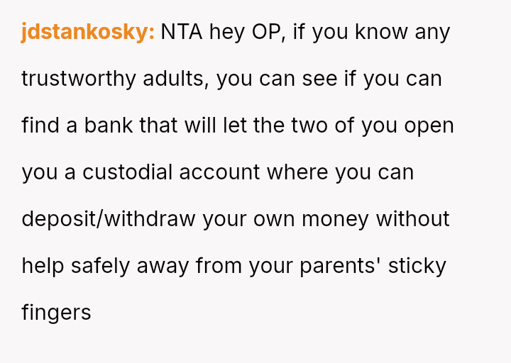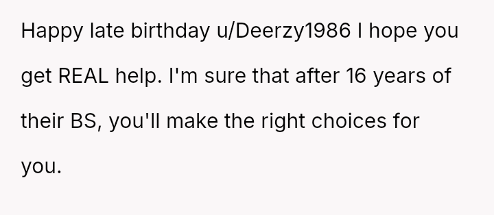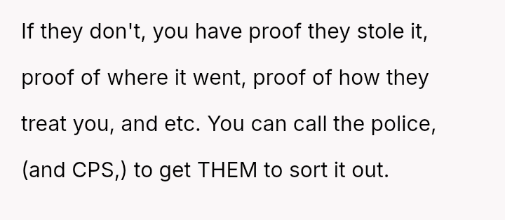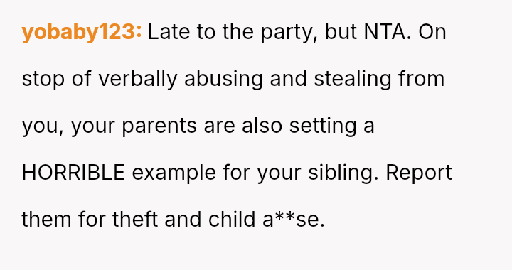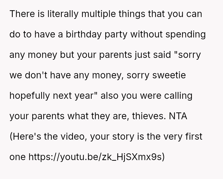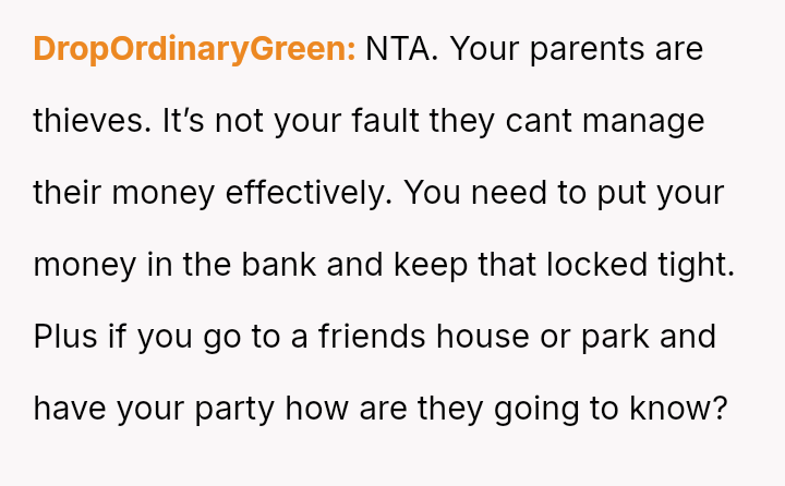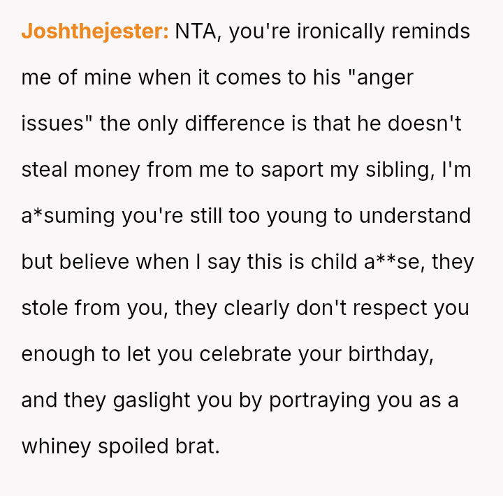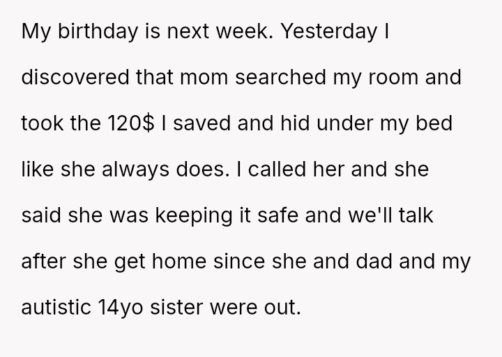 The core question remains whether the parents' alleged necessity in preventing a meltdown outweighs their v***ation of the OP's right to their own earned funds and birthday plans.