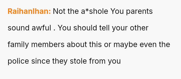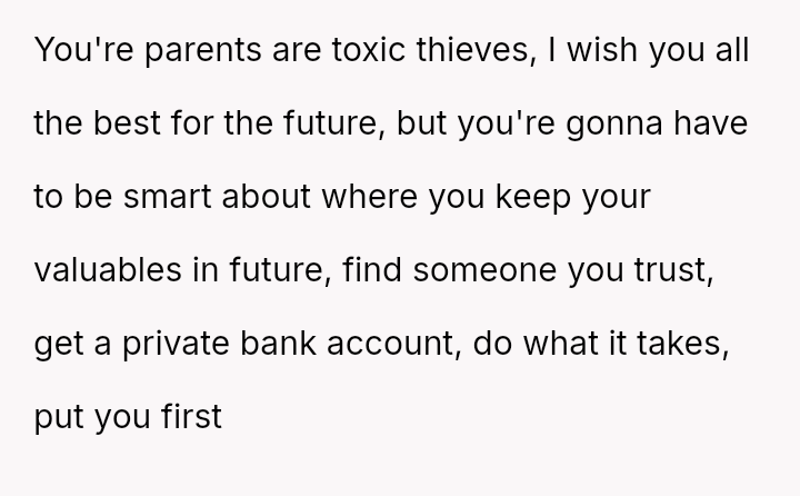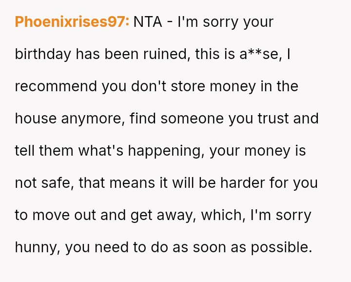 The original poster (OP) is facing a painful situation where personal savings, accumulated through hard work for a significant milestone birthday, were taken and spent without permission on a sibling.