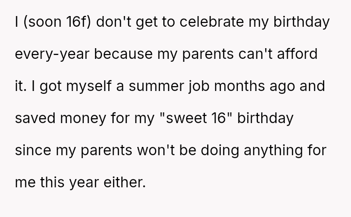 She had dreamed of this day for months—her sweet 16, a milestone she planned to celebrate on her own terms with the money she had painstakingly saved from her summer job.