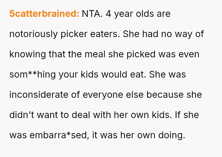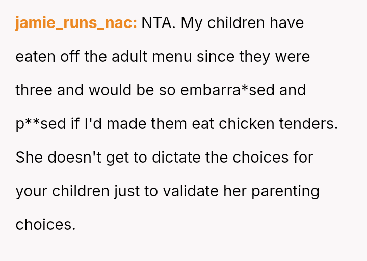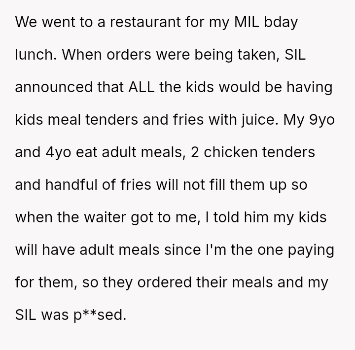 The Original Poster (OP) faced a situation where their decision to order appropriate meals for their children directly contradicted the plan set forth by their Sister-in-Law (SIL) during a family birthday lunch.