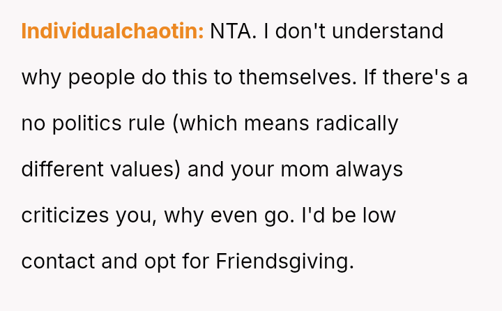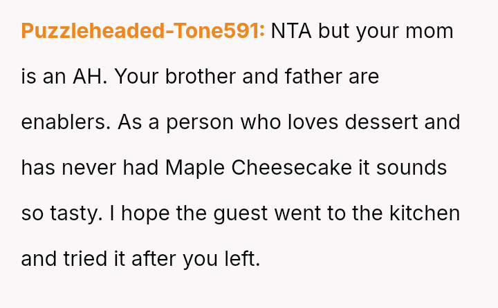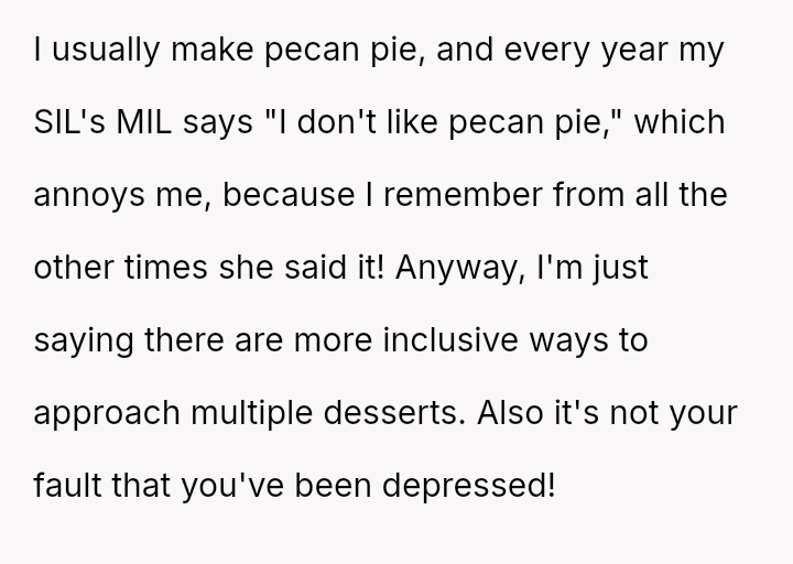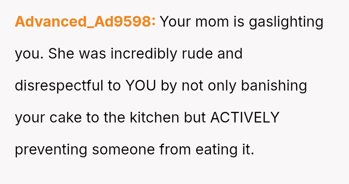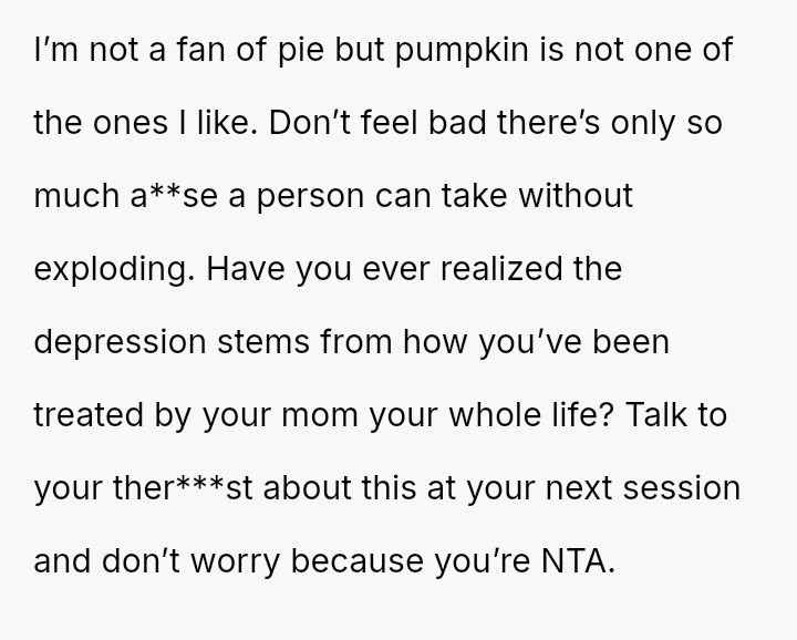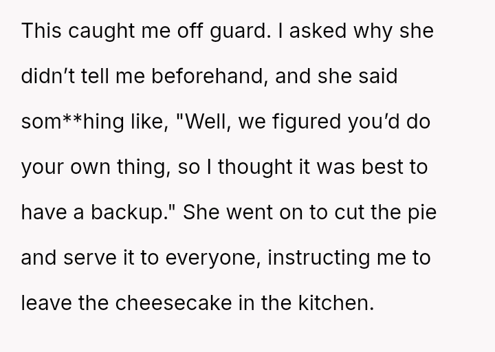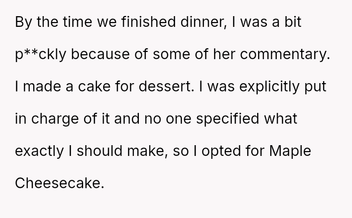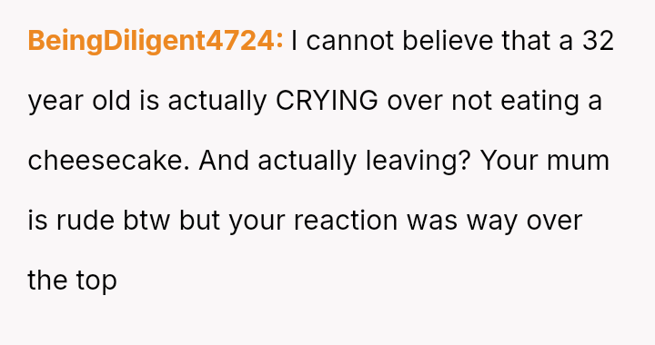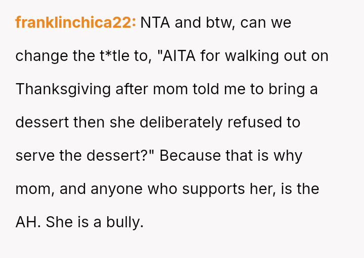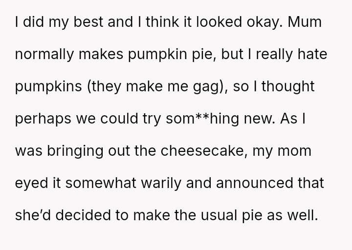The Original Poster (OP) felt deeply hurt by their mother's persistent criticism and subsequent public dismissal of the dessert they prepared for Thanksgiving dinner.