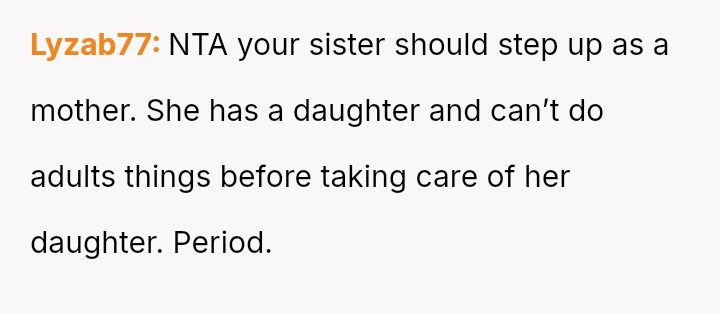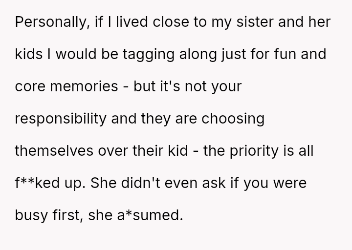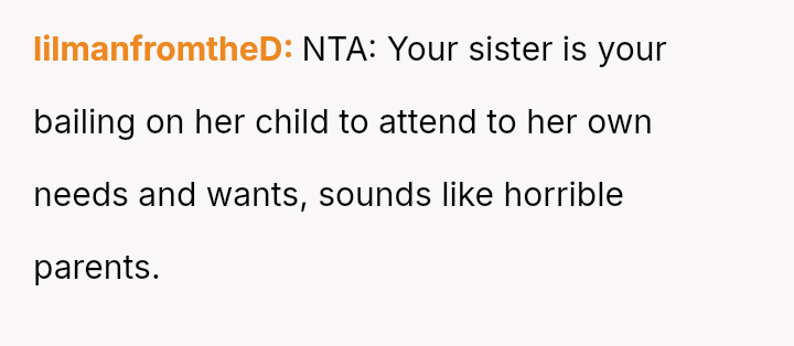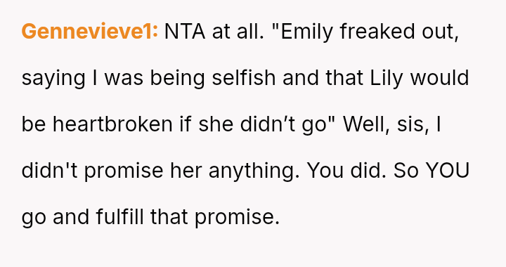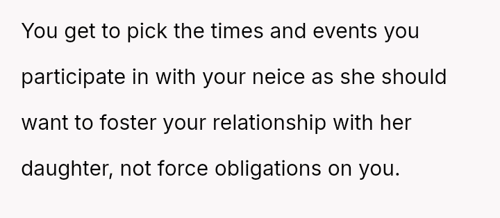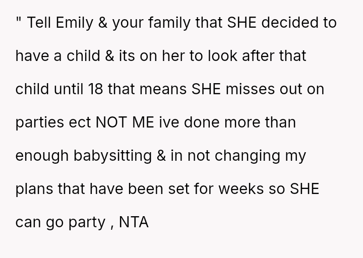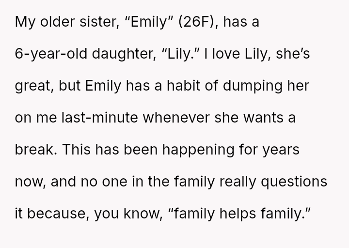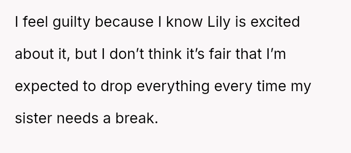 The original poster (OP) is facing significant emotional conflict because while she values her relationship with her niece, she feels consistently taken advantage of by her sister, Emily, who treats her as an automatic caregiver.