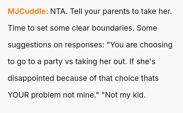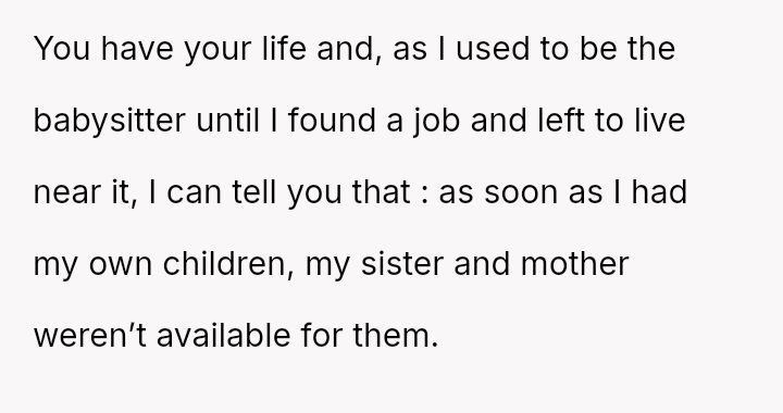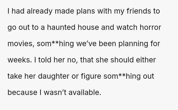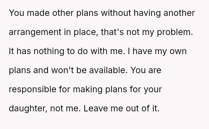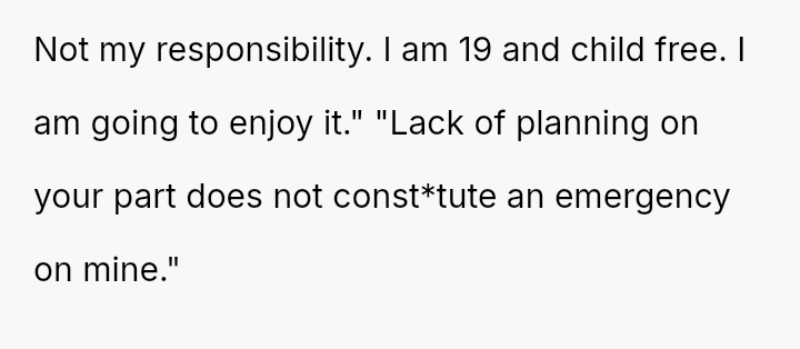 The central tension lies between the OP's necessary self-preservation and her family's expectation that she should always sacrifice her plans to fulfill the role of the reliable backup parent.