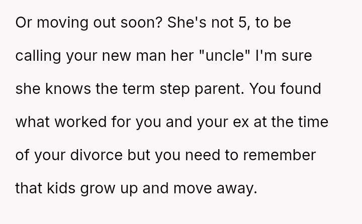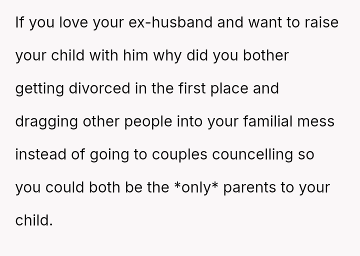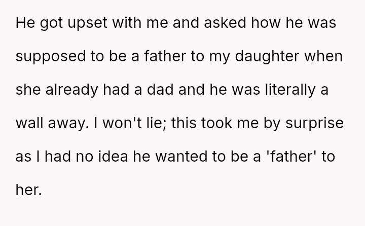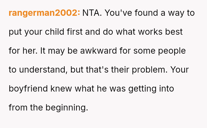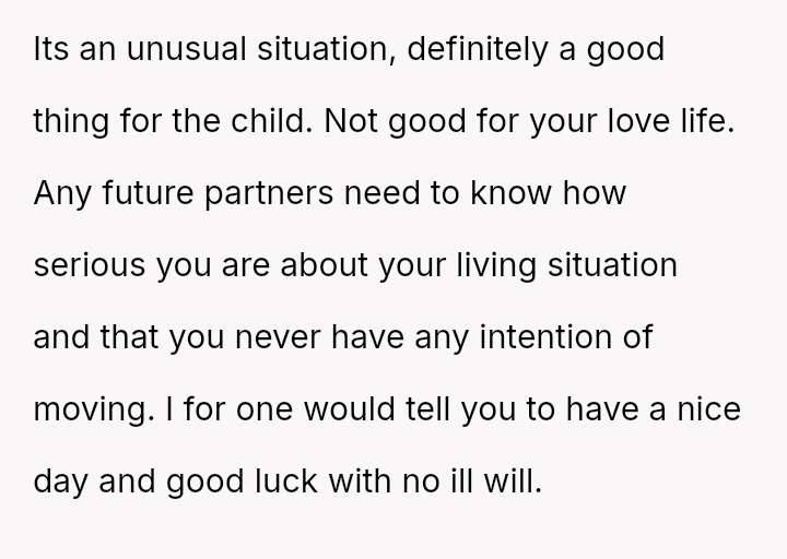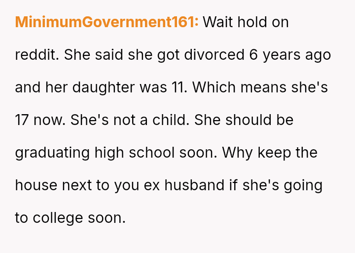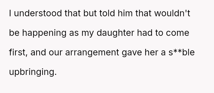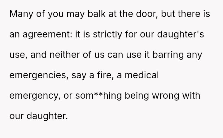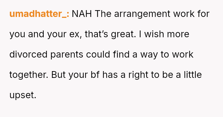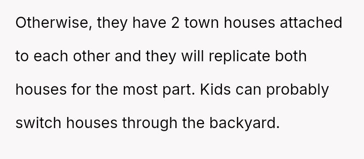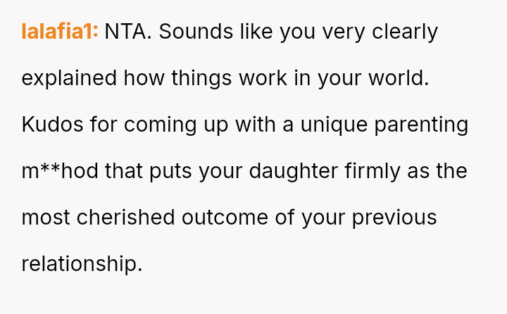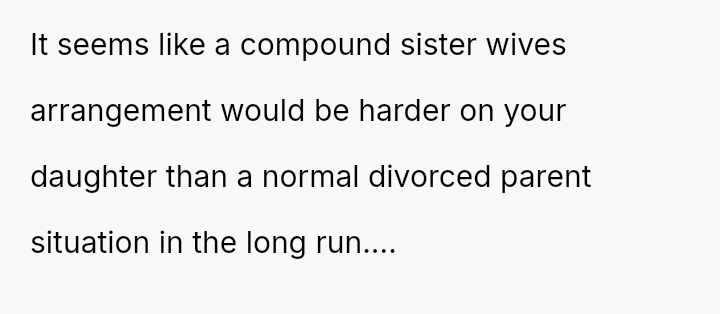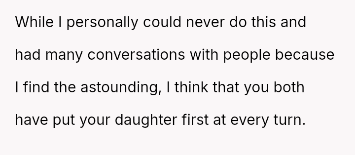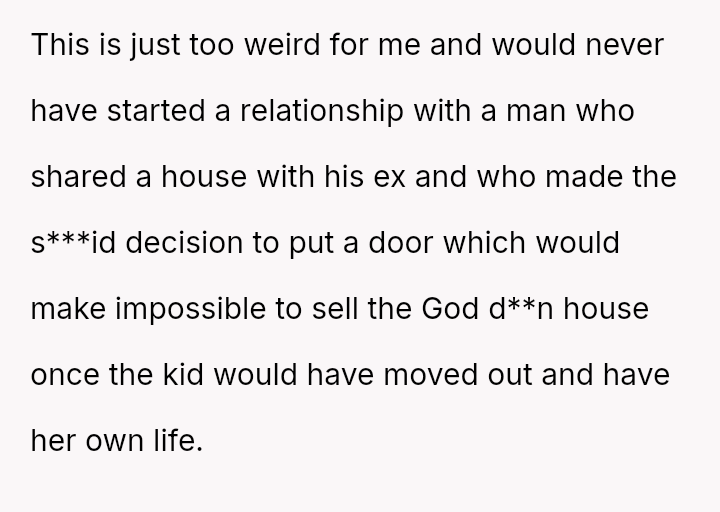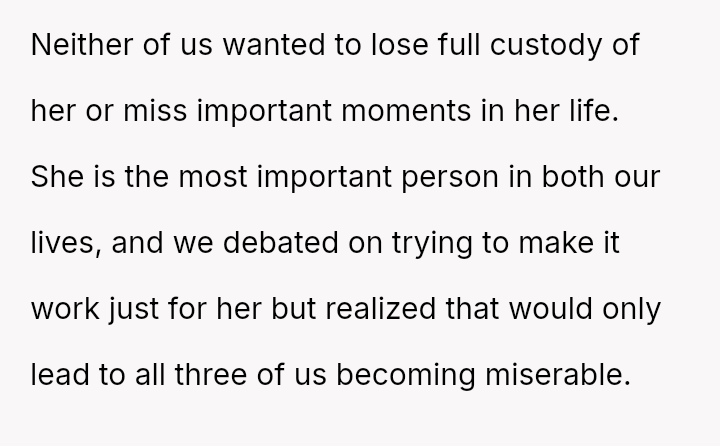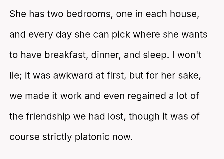 The Original Poster (OP) es**blished a highly unconventional but functional co-parenting structure with their ex-husband, prioritizing their daughter's s**bility by living in adjoining houses.