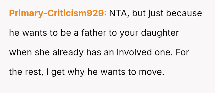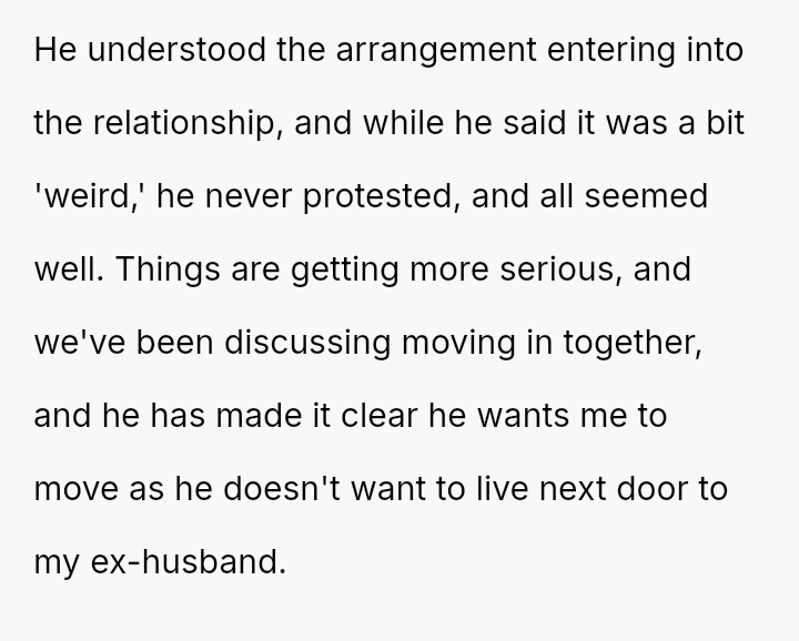 The central conflict arises when the OP's current boyfriend demands they move to end the proximity to the ex-husband, putting the es**blished, positive routine for the daughter in direct opposition to the boyfriend's expectation of a traditional relationship structure.