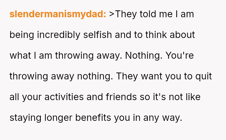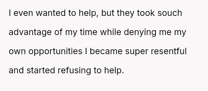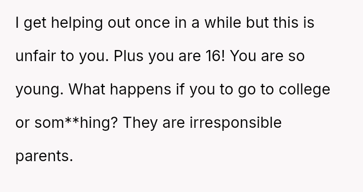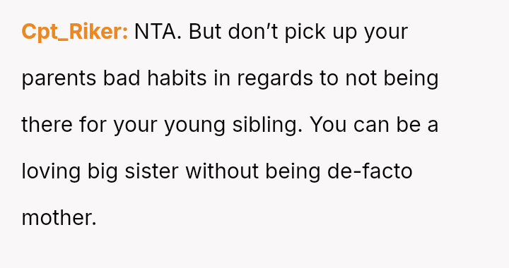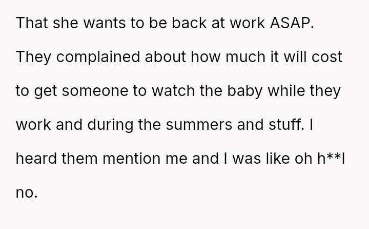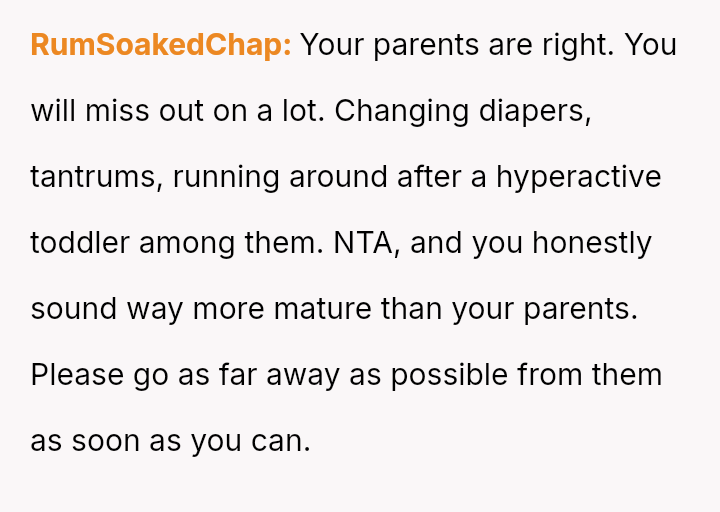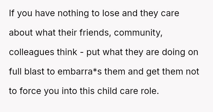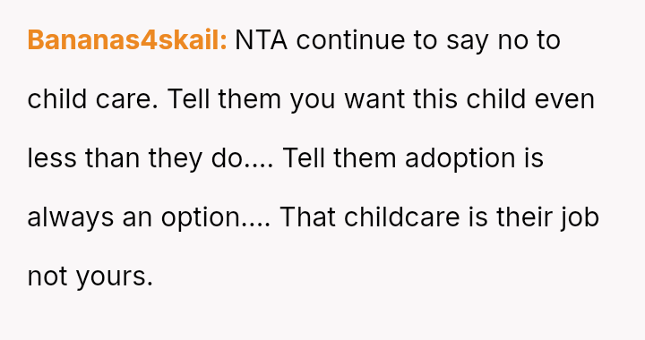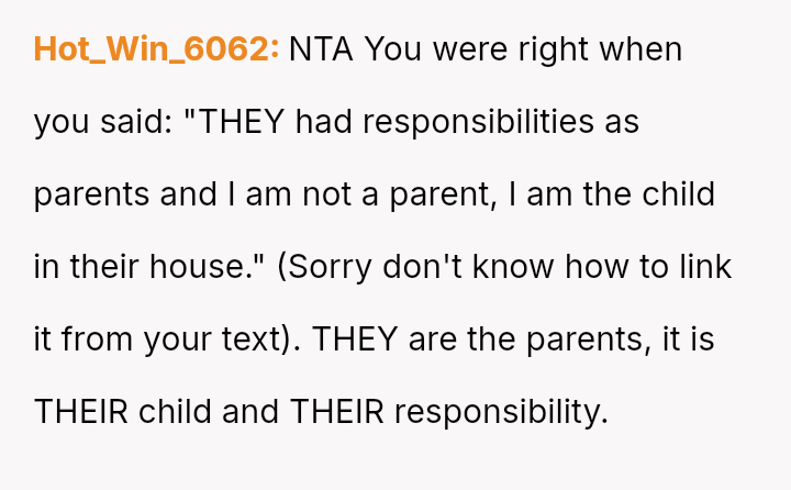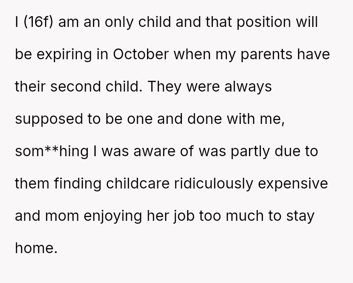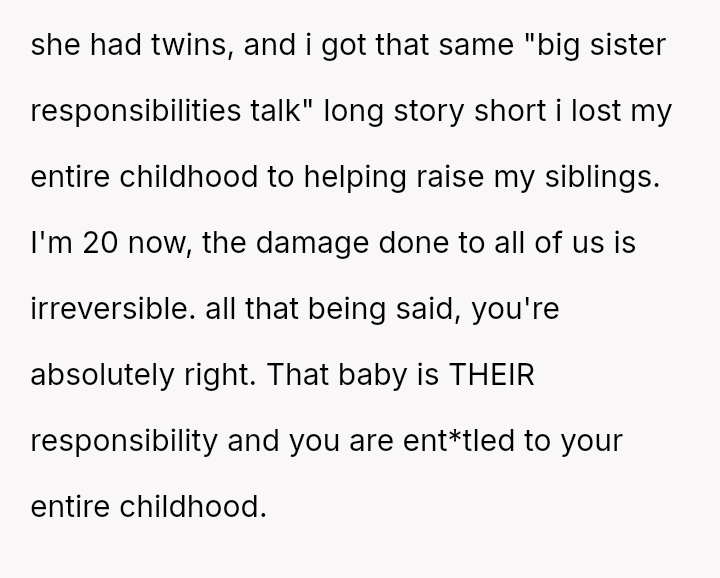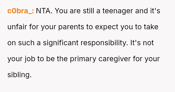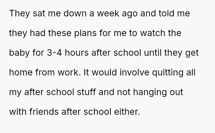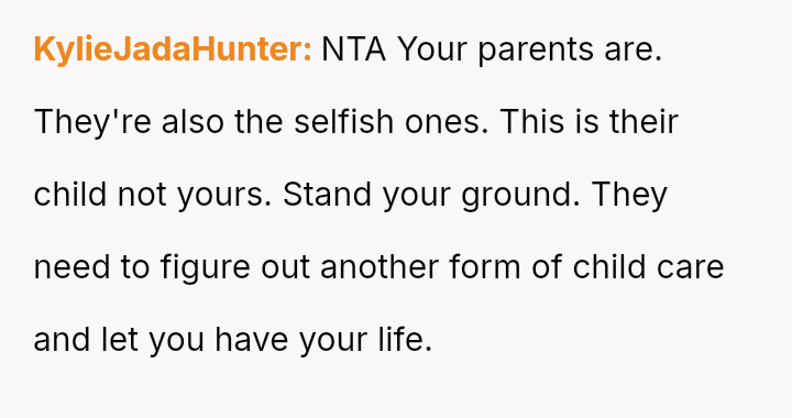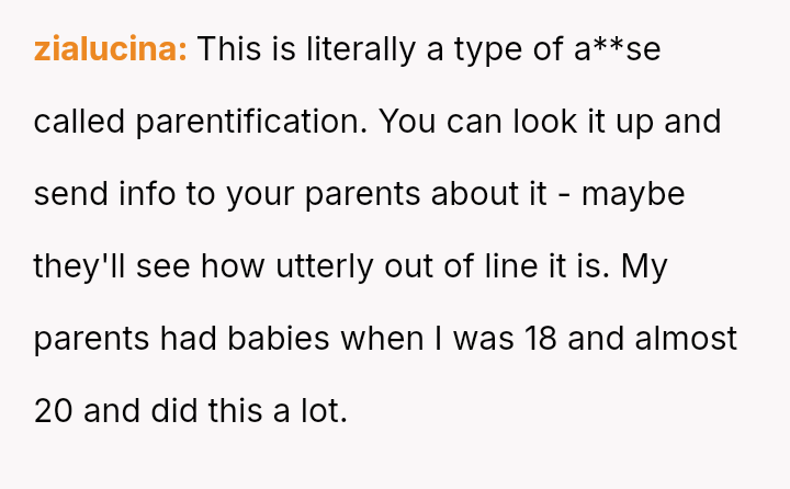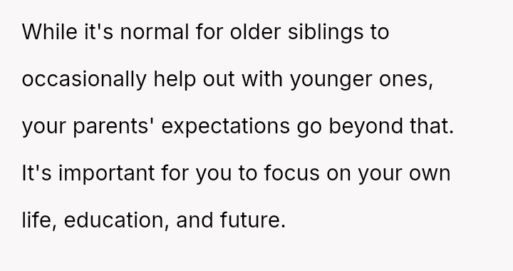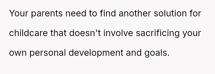 The original poster (OP) feels that their parents are attempting to shift adult childcare responsibilities onto them, conflicting sharply with the OP's es**blished ident*ty as a child with their own life and future plans.