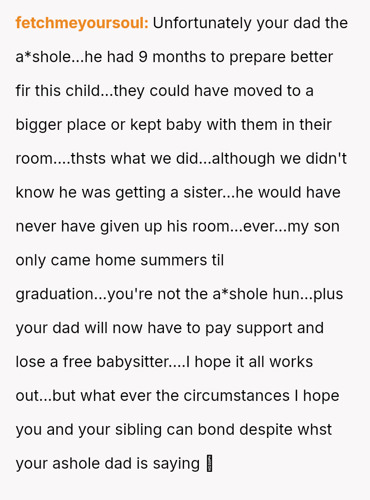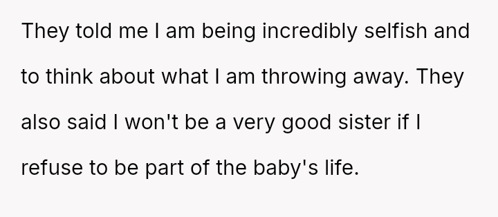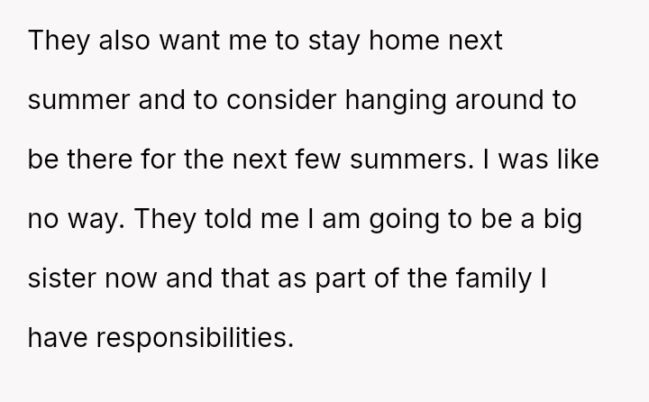 The parents view the OP's refusal as selfish and a dereliction of expected familial duty now that a new sibling is arriving.