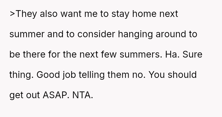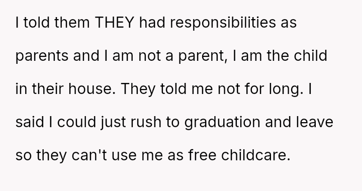 Given the parents' lack of involvement and their immediate expectation for the OP to provide extensive, unpaid childcare, is the OP justified in prioritizing their education and personal freedom by planning early graduation, or are they acting unfairly by refusing to contribute to the family's sudden logistical needs?