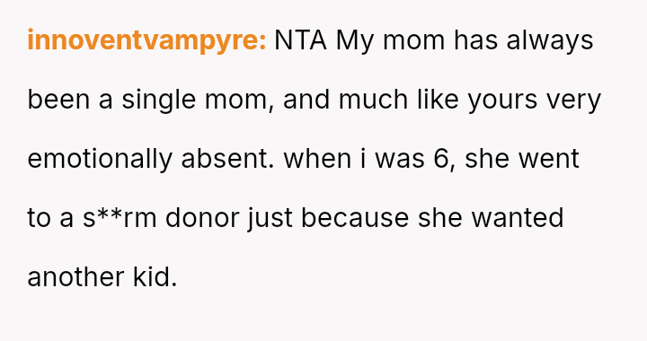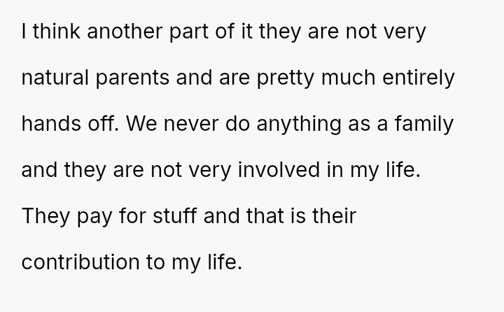 Their detachment isn’t new; they’ve always been distant, their love measured in payments rather than presence. Yet the sting of being replaced, of losing her exclusive place in a family that barely feels like one, cuts deeper than she expected.