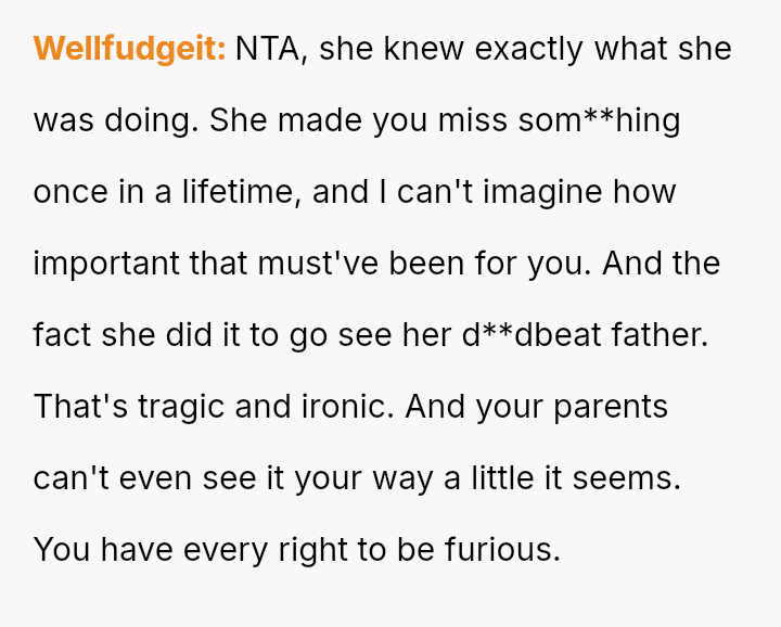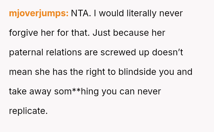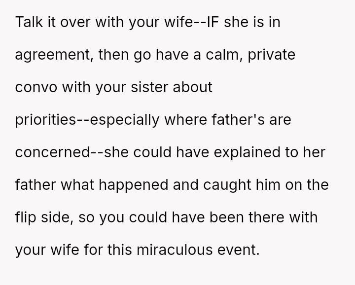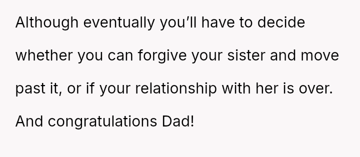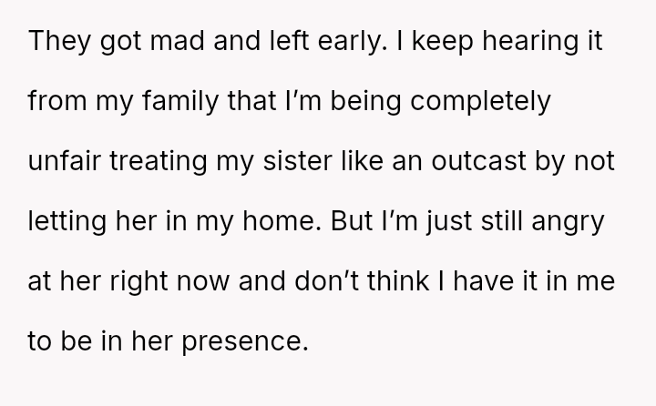 Is the poster justified in maintaining a severe exclusion of his sister weeks after the event to process his profound sense of loss, or does his refusal to allow reconciliation const*tute an excessive and unfair punishment that damages broader family unity?