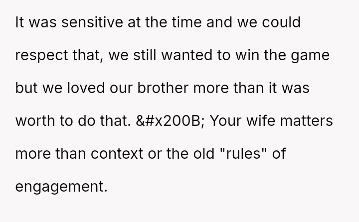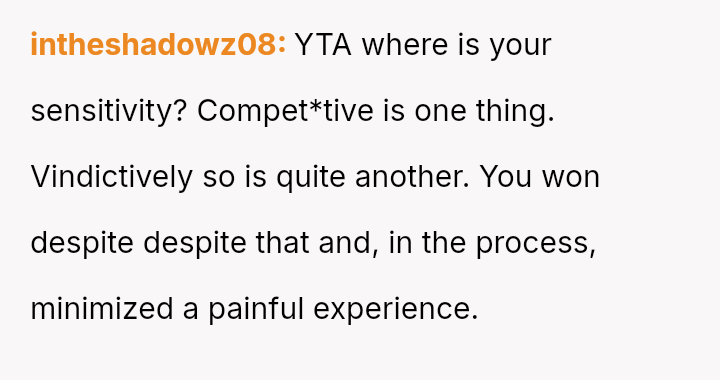 The original poster (OP) prioritizes their es**blished pattern of intense compet*tion within the marriage, choosing to prioritize winning a game over perceived sensitivity to his wife's recent emotional trauma.