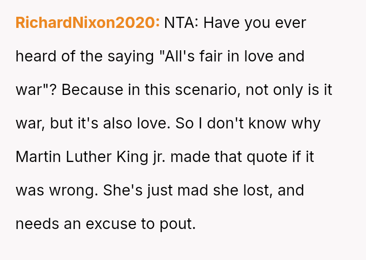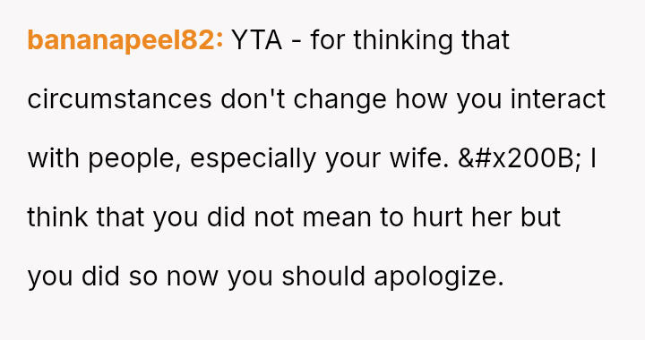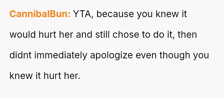 The central conflict lies between the OP's belief that this compet*tive dynamic excuses his actions and his wife's profound hurt stemming from the word choice on a sensitive subject.