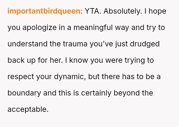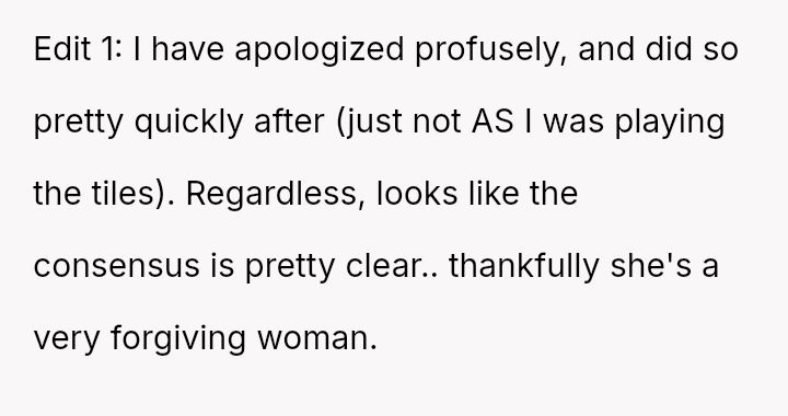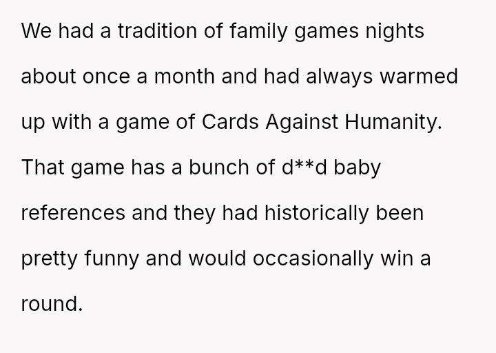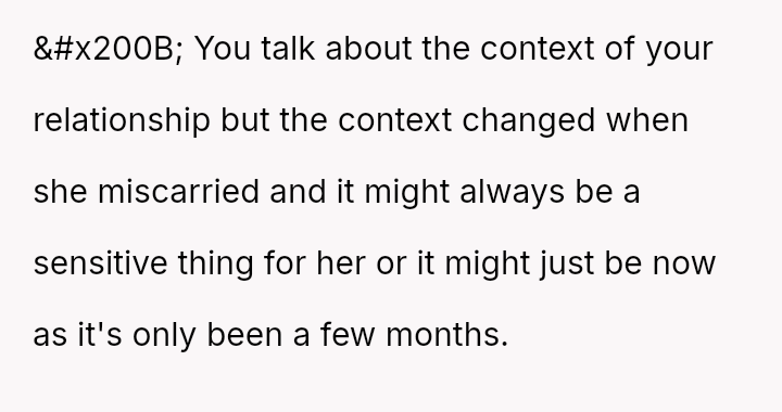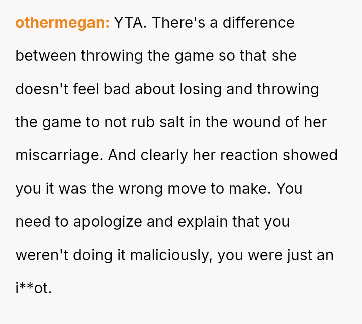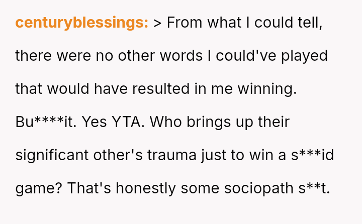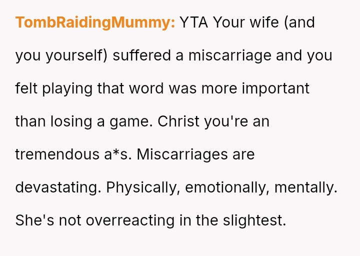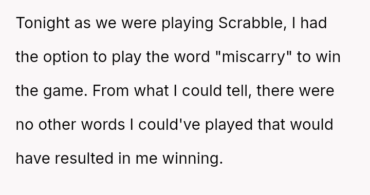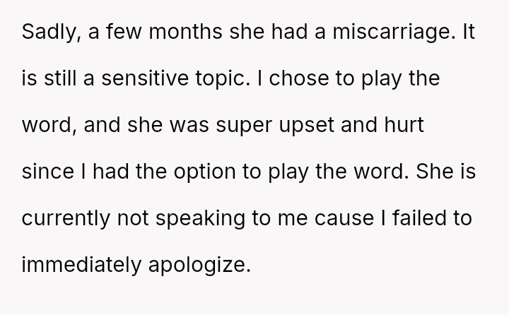 Given the immediate, deep emotional reaction caused by playing a word directly related to a recent miscarriage, was the OP's commitment to the game's compet*tive structure an appropriate response, or did the sensitivity of the topic demand temporary suspension of that rule? Should relationship history always yield to acute emotional vulnerability?