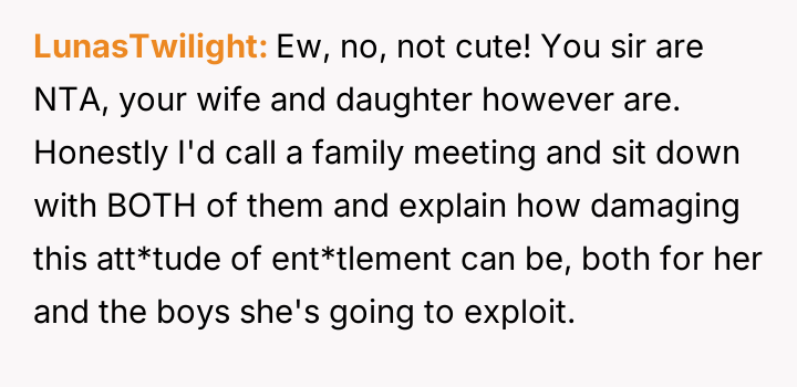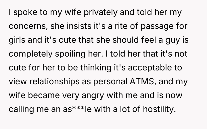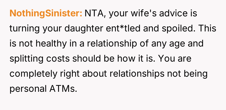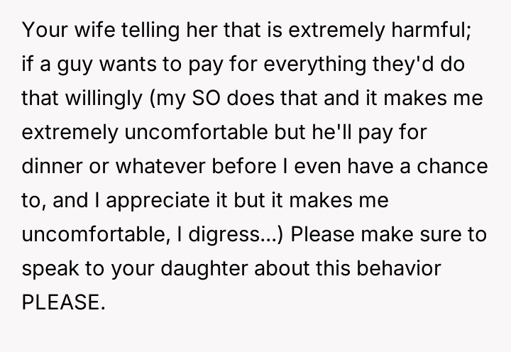 AITA for telling my wife it’s not ‘cute’ for her to encourage our teenage daughter to expect her boyfriend to pay for EVERYTHING in their relationship?